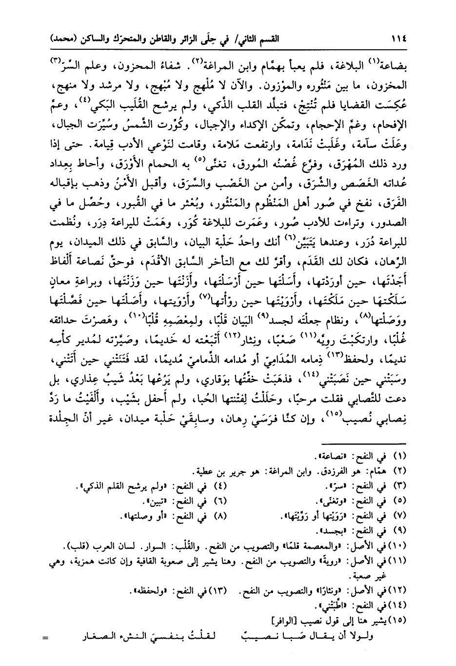 بضاعة «1» البلاغة، فلم يعبأ بهمّام وابن المراغة «2» . شفاء المحزون، وعلم السّرّ «3» المخزون، ما بين منثوره والموزون. والآن لا ملهج ولا مبهج، ولا مرشد ولا منهج، عكست القضايا فلم تنتج، فتبلّد القلب الذّكي، ولم يرشح القليب البكي «4» ، وعمّ الإفحام، وغمّ الإحجام، وتمكّن الإكداء والإجبال، وكوّرت الشّمس وسيّرت الجبال، وعلت سآمة، وغلبت ندامة، وارتفعت ملامة، وقامت لنوعي الأدب قيامة. حتى إذا ورد ذلك المهرق، وفرّع غصنه المورق، تغنّى «5» به الحمام الأورق، وأحاط بعداد عداته الغصص والشّرق، وأمن من الغصب والسّرق، وأقبل الأمن وذهب بإقباله الفرق، نفخ في صور أهل المنظوم والمنثور، وبعثر ما في القبور، وحصّل ما في الصدور، وتراءت للأدب صور، وعمرت للبلاغة كور، وهمت لليراعة درر، ونظمت للبراعة درر، وعندها يتبيّن «6» أنك واحد حلبة البيان، والسّابق في ذلك الميدان، يوم الرّهان، فكان لك القدم، وأقرّ لك مع التأخر السّابق الأقدم، فوحقّ نصاعة ألفاظ أجدتها، حين أوردتها، وأسلتها حين أرسلتها، وأزنتها حين وزنتها، وبراعة معان سلكتها حين ملكتها، وأرويتها حين روّأتها «7» وأرويتها، وأصلتها حين فصّلتها ووصلتها «8» ، ونظام جعلته لجسد «9» البيان قلبا، ولمعصمه قلبا «10» ، وهصرت حدائقه غلبا، وارتكبت رويّه «11» صعبا، ونثار «12» أتبعته له خديما، وصيّرته لمدير كأسه نديما، ولحفظ «13» ذمامه المداميّ أو مدامه الذّماميّ مديما، لقد فتنتني حين أتتني، وسبتني حين نصبتني «14» ، فذهبت خفّتها بوقاري، ولم يرعها بعد شيب عذاري، بل دعت للتّصابي فقلت مرحبا، وحللت لفتنتها الحبا، ولم أحفل بشيب، وألفيت ما ردّ نصابي نصيب «15» ، وإن كنّا فرسي رهان، وسابقي حلبة ميدان، غير أنّ الجلدة