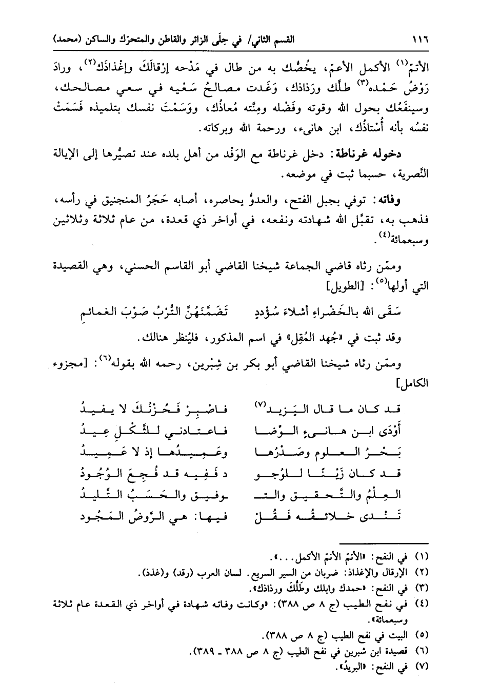 الأتم «1» الأكمل الأعمّ، يخصّك به من طال في مدحه إرقالك وإغذاذك «2» ، وراد روض حمده «3» طلّك ورذاذك، وغدت مصالح سعيه في سعي مصالحك، وسينفعك بحول الله وقوته وفضله ومنّته معاذك، ووسمت نفسك بتلميذه فسمت نفسه بأنه أستاذك، ابن هانىء، ورحمة الله وبركاته.