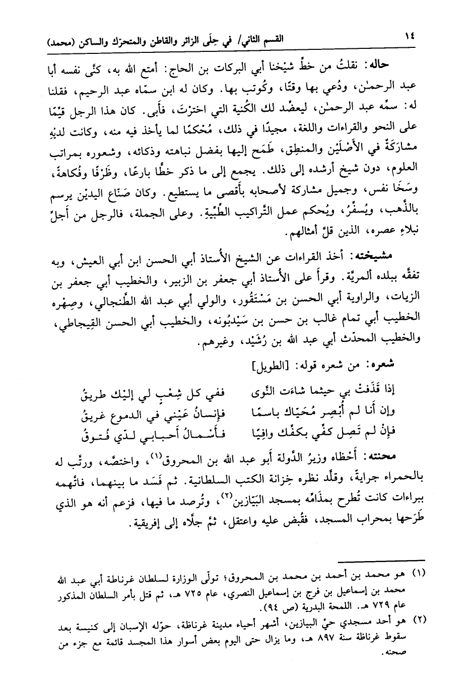 محنته: أحظاه وزير الدّولة أبو عبد الله بن المحروق «1» ، واختصّه، ورتّب له بالحمراء جراية، وقلّد نظره خزانة الكتب السلطانية. ثم فسد ما بينهما، فاتّهمه ببراءات كانت تطرح بمذامّه بمسجد البيّازين «2» ، وترصد ما فيها، فزعم أنه هو الذي طرحها بمحراب المسجد، فقبض عليه واعتقل، ثمّ جلّاه إلى إفريقية.
