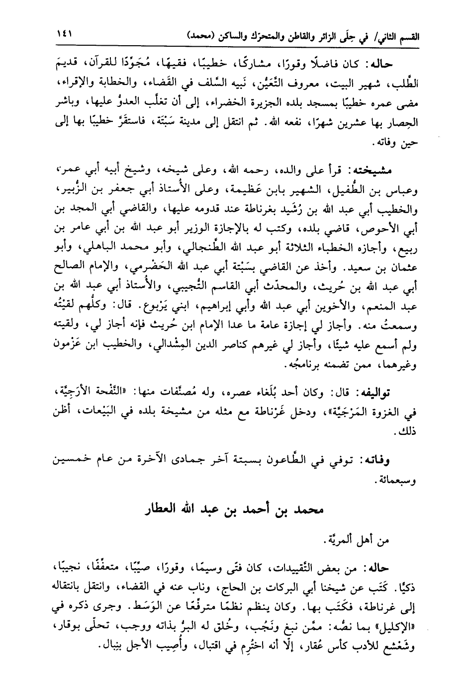 تواليفه: قال: وكان أحد بلغاء عصره، وله مصنّفات منها: «النّفحة الأرجيّة، في الغزوة المرجيّة» ، ودخل غرناطة مع مثله من مشيخة بلده في البيعات، أظن ذلك.