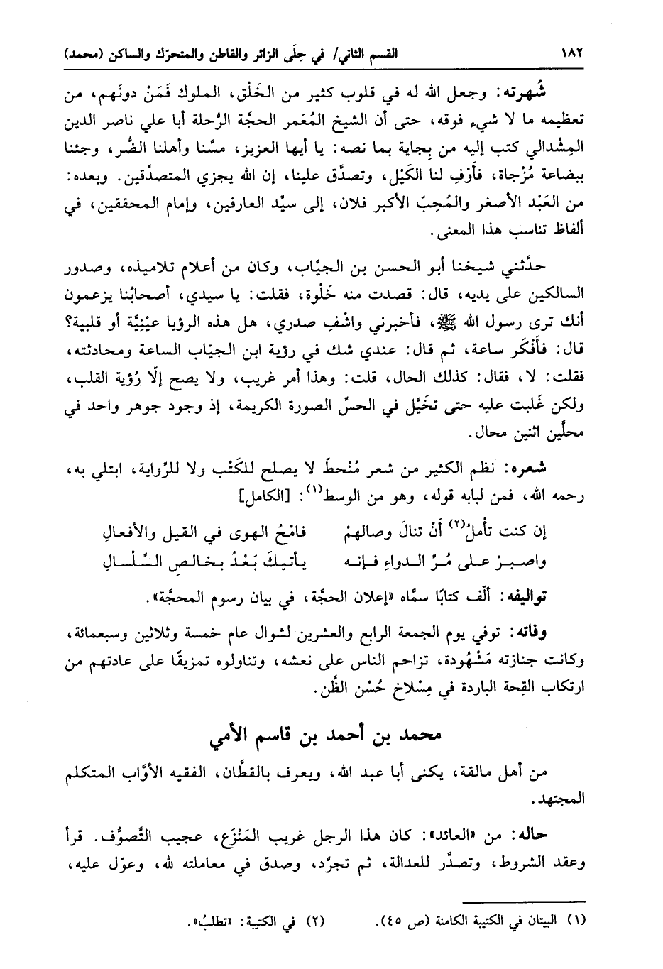 قال: فأفكر ساعة، ثم قال: عندي شك في رؤية ابن الجيّاب الساعة ومحادثته، فقلت: لا، فقال: كذلك الحال، قلت: وهذا أمر غريب، ولا يصح إلّا رؤية القلب، ولكن غلبت عليه حتى تخيّل في الحسّ الصورة الكريمة، إذ وجود جوهر واحد في محلّين اثنين محال.