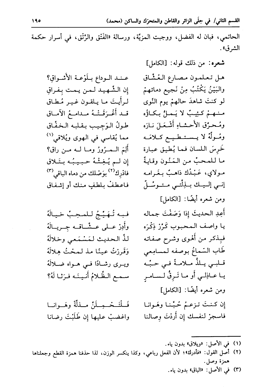 الحاتمي، فبان له الفضل، ووجبت المزيّة، ورسالة «الفتق والرّتق، في أسرار حكمة الشرق» .