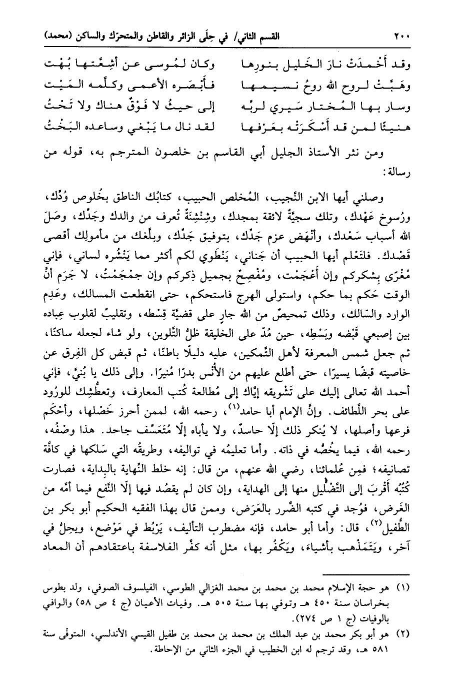 وصلني أيها الابن النّجيب، المخلص الحبيب، كتابك الناطق بخلوص ودّك، ورسوخ عهدك، وتلك سجيّة لائقة بمجدك، وشنشنة تعرف من والدك وجدّك، وصل الله أسباب سعدك، وأنهض عزم جدّك، بتوفيق جدّك، وبلّغك من مأمولك أقصى قصدك. فلتعلم أيها الحبيب أن جناني، ينطوي لكم أكثر مما ينشره لساني، فإني مغرى بشكركم وإن أعجمت، ومفصح بجميل ذكركم وإن جمجمت، لا جرم أنّ الوقت حكم بما حكم، واستولى الهرج فاستحكم، حتى انقطعت المسالك، وعدم الوارد والسّالك، وذلك تمحيص من الله جار على قضيّة قسطه، وتقليب لقلوب عباده بين إصبعي قبضه وبسطه، حين مدّ على الخليقة ظلّ التّلوين، ولو شاء لجعله ساكنا، ثم جعل شمس المعرفة لأهل التّمكين، عليه دليلا باطنا، ثم قبض كل الفرق عن خاصيته قبضا يسيرا، حتى أطلع عليهم من الأنس بدرا منيرا. وإلى ذلك يا بنيّ، فإني أحمد الله تعالى إليك على تشويقه إيّاك إلى مطالعة كتب المعارف، وتعطّشك للورود على بحر اللّطائف. وإنّ الإمام أبا حامد «1» ، رحمه الله، لممن أحرز خصلها، وأحكم فرعها وأصلها، لا ينكر ذلك إلّا حاسد، ولا يأباه إلّا متعسّف جاحد. هذا وصفه، رحمه الله، فيما يخصّه في ذاته. وأما تعليمه في تواليفه، وطريقه التي سلكها في كافّة تصانيفه؛ فمن علمائنا، رضي الله عنهم، من قال: إنه خلط النّهاية بالبداية، فصارت كتبه أقرب إلى التّضليل منها إلى الهداية، وإن كان لم يقصد فيها إلّا النّفع فيما أمّه من الغرض، فوجد في كتبه الضّرر بالعرض، وممن قال بهذا الفقيه الحكيم أبو بكر بن الطّفيل «2» ، قال: وأما أبو حامد، فإنه مضطرب التأليف، يربط في موضع، ويحلّ في آخر، ويتمذهب بأشياء، ويكفر بها، مثل أنه كفّر الفلاسفة باعتقادهم أن المعاد