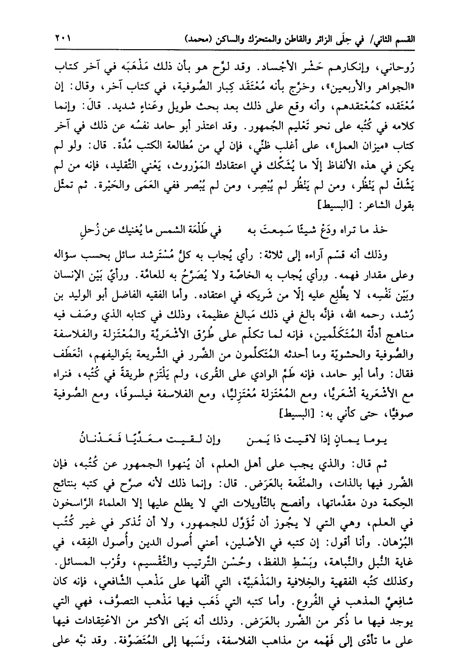 روحاني، وإنكار هم حشر الأجساد. وقد لوّح هو بأن ذلك مذهبه في آخر كتاب «الجواهر والأربعين» ، وخرّج بأنه معتقد كبار الصّوفية، في كتاب آخر، وقال: إن معتقده كمعتقدهم، وأنه وقع على ذلك بعد بحث طويل وعناء شديد. قال: وإنما كلامه في كتبه على نحو تعليم الجمهور. وقد اعتذر أبو حامد نفسه عن ذلك في آخر كتاب «ميزان العمل» ، على أغلب ظنّي، فإن لي من مطالعة الكتب مدّة. قال: ولو لم يكن في هذه الألفاظ إلّا ما يشكّك في اعتقادك الموروث، يعني التّقليد، فإنه من لم يشكّ لم ينظر، ومن لم ينظر لم يبصر، ومن لم يبصر ففي العمى والحيرة. ثم تمثّل بقول الشاعر: [البسيط]