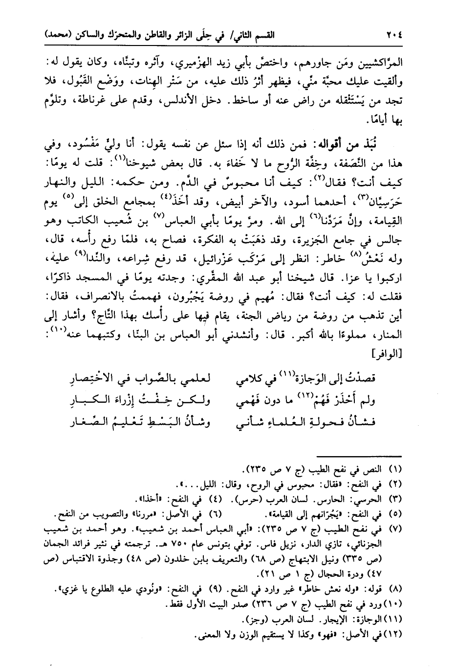 كيف أنت؟ فقال «2» : كيف أنا محبوس في الدّم. ومن حكمه: الليل والنهار حرسيّان «3» ، أحدهما أسود، والآخر أبيض، وقد أخذ «4» بمجامع الخلق إلى «5» يوم القيامة، وإنّ مردّنا «6» إلى الله. ومرّ يوما بأبي العباس «7» بن شعيب الكاتب وهو جالس في جامع الجزيرة، وقد ذهبت به الفكرة، فصاح به، فلمّا رفع رأسه، قال، وله نعش «8» خاطر: انظر إلى مركب عزرائيل، قد رفع شراعه، والنّدا «9» عليه، اركبوا يا عزا. قال شيخنا أبو عبد الله المقري: وجدته يوما في المسجد ذاكرا، فقلت له: كيف أنت؟ فقال: مهيم في روضة يجبرون، فهممت بالانصراف، فقال: