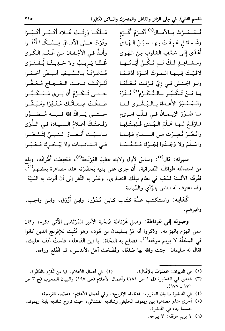 سيرته: قال «3» : وساس لأول ولايته عظيم الفرنحة «4» ، فحفظت أطرافه، وبلغ من استمالته طوائف النّصرانية، أن جرى على يديه بحضرته عقد مصاهرة بعضهم «5» ، فقرفته الألسنة لسعيه في نظام سلك النصارى. وعمر به الثّغر إلى أن ألوت به المنيّة.