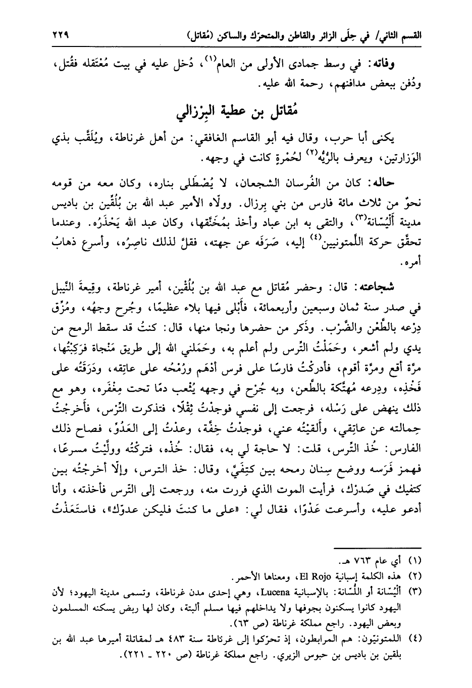 شجاعته: قال: وحضر مقاتل مع عبد الله بن بلقين، أمير غرناطة، وقيعة النّيبل في صدر سنة ثمان وسبعين وأربعمائة، فأبلى فيها بلاء عظيما، وجرح وجهه، ومزّق درعه بالطّعن والضّرب. وذكر من حضرها ونجا منها، قال: كنت قد سقط الرمح من يدي ولم أشعر، وحملت التّرس ولم أعلم به، وحملني الله إلى طريق منجاة فركبتها، مرّة أقع ومرّة أقوم، فأدركت فارسا على فرس أدهم ورمحه على عاتقه، ودرقته على فخذه، ودرعه مهتّكة بالطّعن، وبه جرح في وجهه يثعب دما تحت مغفره، وهو مع ذلك ينهض على رسله، فرجعت إلى نفسي فوجدت ثقلا، فتذكرت التّرس، فأخرجت حمالته عن عاتقي، وألقيته عني، فوجدت خفّة، وعدت إلى العدوّ، فصاح ذلك الفارس: خذ التّرس، قلت: لا حاجة لي به، فقال: خذه، فتركته وولّيت مسرعا، فهمز فرسه ووضع سنان رمحه بين كتفيّ، وقال: خذ الترس، وإلّا أخرجته بين كتفيك في صدرك، فرأيت الموت الذي فررت منه، ورجعت إلى التّرس فأخذته، وأنا أدعو عليه، وأسرعت عدوا، فقال لي: «على ما كنت فليكن عدوّك» ، فاستعذت
