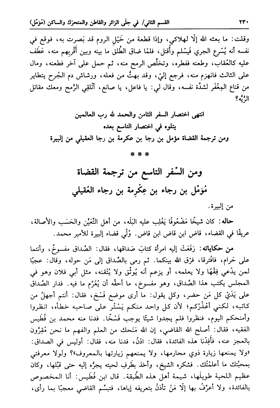 انتهى اختصار السفر الثامن والحمد لله رب العالمين يتلوه في اختصار التاسع بعده ومن ترجمة القضاة مؤمل بن رجا بن عكرمة بن رجا العقيلي من إلبيرة*** ومن السّفر التاسع من ترجمة القضاة