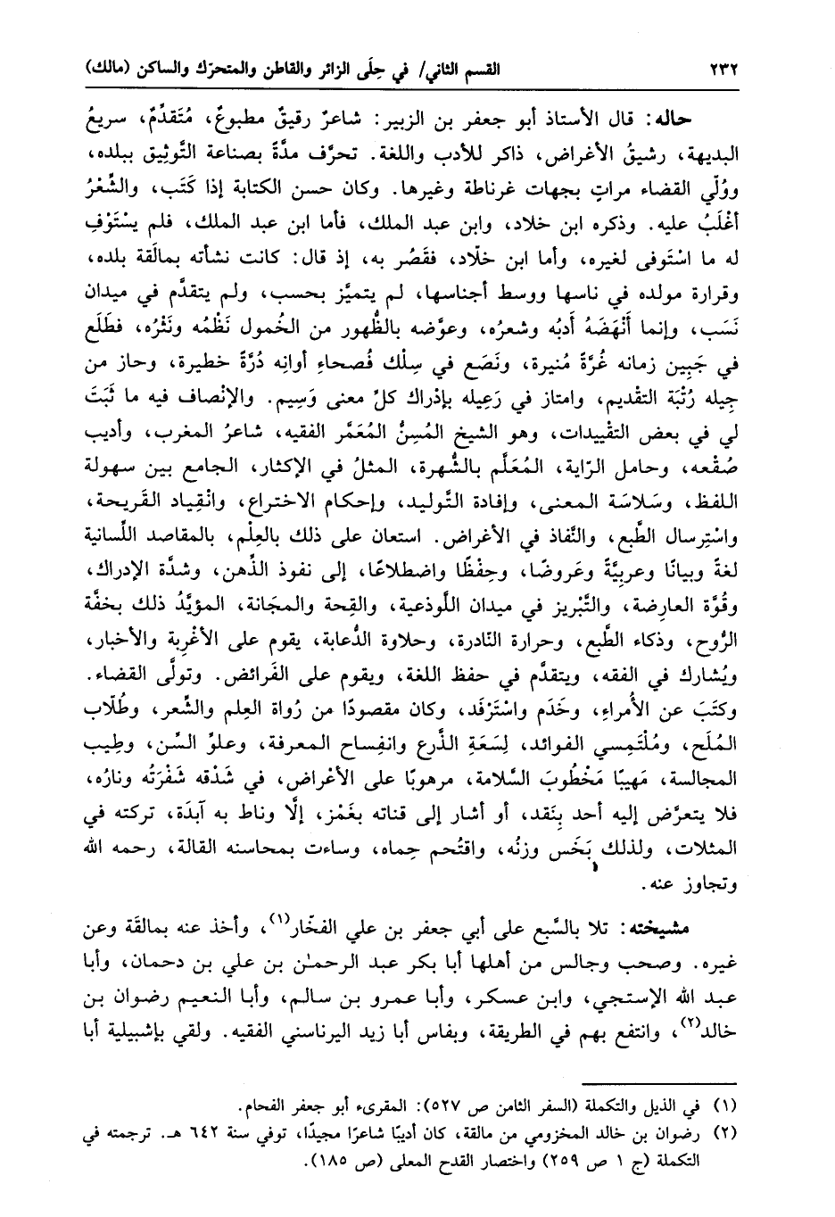 مشيخته: تلا بالسّبع على أبي جعفر بن علي الفخّار «1» ، وأخذ عنه بمالقة وعن غيره. وصحب وجالس من أهلها أبا بكر عبد الرحمن بن علي بن دحمان، وأبا عبد الله الإستجي، وابن عسكر، وأبا عمرو بن سالم، وأبا النعيم رضوان بن خالد «2» ، وانتفع بهم في الطريقة، وبفاس أبا زيد اليرناسني الفقيه. ولقي بإشبيلية أبا