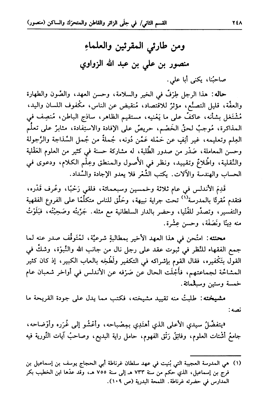 حاله: هذا الرجل طرف في الخير والسلامة، وحسن العهد، والصّون والطهارة والعفّة، قليل التصنّع، مؤثر للاقتصاد، منقبض عن الناس، مكفوف اللسان واليد، مشتغل بشأنه، عاكف على ما يعنيه، مستقيم الظاهر، ساذج الباطن، منصف في المذاكرة، موجب لحقّ الخصم، حريص على الإفادة والاستفادة، مثابر على تعلّم العلم وتعليمه، غير أنف عن حمله عمّن دونه، جملة من جمل السّذاجة والرّجولة وحسن المعاملة، صدر من صدور الطّلبة، له مشاركة حسنة في كثير من العلوم العقلية والنّقلية، واطّلاع وتقييد، ونظر في الأصول والمنطق وعلم الكلام، ودعوى في الحساب والهندسة والآلات. يكتب الشّعر فلا يعدو الإجادة والسّداد.