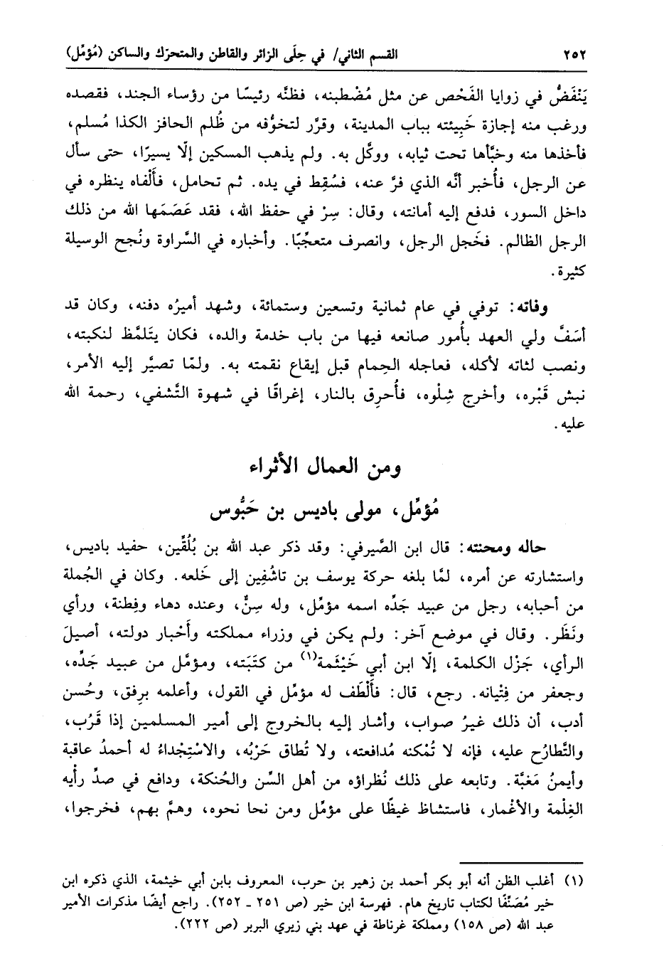 حاله ومحنته: قال ابن الصّيرفي: وقد ذكر عبد الله بن بلقّين، حفيد باديس، واستشارته عن أمره، لمّا بلغه حركة يوسف بن تاشفين إلى خلعه. وكان في الجملة من أحبابه، رجل من عبيد جدّه اسمه مؤمّل، وله سنّ، وعنده دهاء وفطنة، ورأي ونظر. وقال في موضع آخر: ولم يكن في وزراء مملكته وأحبار دولته، أصيل الرأي، جزل الكلمة، إلّا ابن أبي خيثمة «1» من كتبته، ومؤمّل من عبيد جدّه، وجعفر من فتيانه. رجع، قال: فألطف له مؤمّل في القول، وأعلمه برفق، وحسن أدب، أن ذلك غير صواب، وأشار إليه بالخروج إلى أمير المسلمين إذا قرب، والتّطارح عليه، فإنه لا تمكنه مدافعته، ولا تطاق حربه، والاستجداء له أحمد عاقبة وأيمن مغبّة. وتابعه على ذلك نظراؤه من أهل السّن والحنكة، ودافع في صدّ رأيه الغلمة والأغمار، فاستشاظ غيظا على مؤمّل ومن نحا نحوه، وهمّ بهم، فخرجوا،