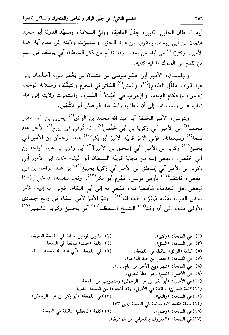 وبتلمسان، الأمير أبو حمّو موسى بن عثمان بن يغمراسن، [سلطان بني عبد الواد، مذلّل الصّقع] «2» ، والمثل «3» السّائر في الحزم والتيقّظ، وصلابة الوجه، زعموا، وإحكام القحة، والإغراب في خبث «4» السّيرة. واستمرّت ولايته إلى عام ثمانية عشر وسبعمائة، إلى أن سطا به ولده عبد الرحمن أبو تاشفين.