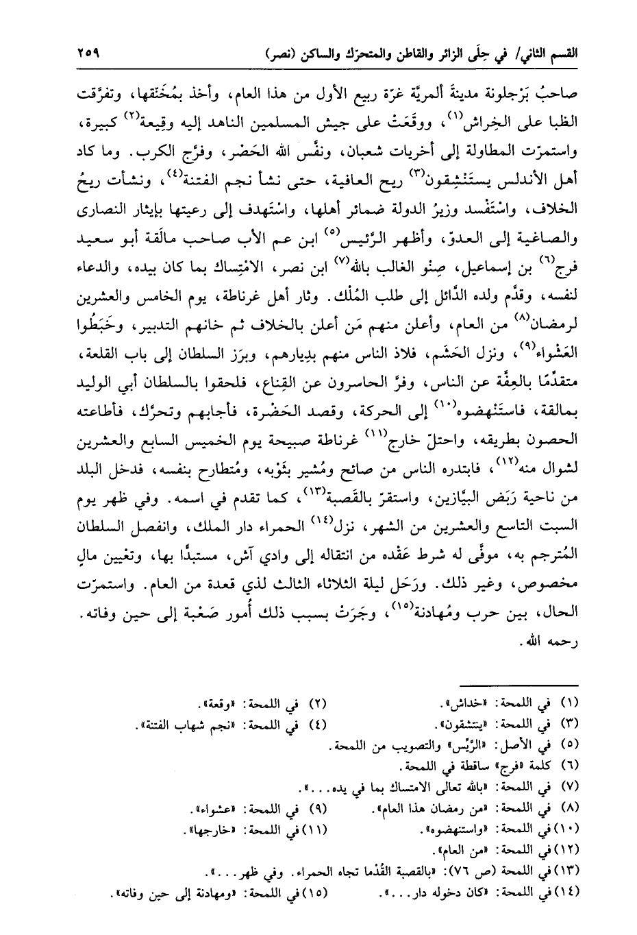صاحب برجلونة مدينة ألمريّة غرّة ربيع الأول من هذا العام، وأخذ بمخنّقها، وتفرّقت الظبا على الخراش «1» ، ووقعت على جيش المسلمين الناهد إليه وقيعة «2» كبيرة، واستمرّت المطاولة إلى أخريات شعبان، ونفّس الله الحصر، وفرّج الكرب. وما كاد أهل الأندلس يستنشقون «3» ريح العافية، حتى نشأ نجم الفتنة «4» ، ونشأت ريح الخلاف، واستفسد وزير الدولة ضمائر أهلها، واستهدف إلى رعيتها بإيثار النصارى والصاغية إلى العدوّ، وأظهر الرّئيس «5» ابن عم الأب صاحب مالقة أبو سعيد فرج «6» بن إسماعيل، صنو الغالب بالله «7» ابن نصر، الامتساك بما كان بيده، والدعاء لنفسه، وقدّم ولده الدّائل إلى طلب الملك. وثار أهل غرناطة، يوم الخامس والعشرين لرمضان «8» من العام، وأعلن منهم من أعلن بالخلاف ثم خانهم التدبير، وخبطوا العشواء «9» ، ونزل الحشم، فلاذ الناس منهم بديارهم، وبرز السلطان إلى باب القلعة، متقدّما بالعفّة عن الناس، وفرّ الحاسرون عن القناع، فلحقوا بالسلطان أبي الوليد بمالقة، فاستنهضوه «10» إلى الحركة، وقصد الحضرة، فأجابهم وتحرّك، فأطاعته الحصون بطريقه، واحتلّ خارج «11» غرناطة صبيحة يوم الخميس السابع والعشرين لشوال منه «12» ، فابتدره الناس من صائح ومشير بثوبه، ومتطارح بنفسه، فدخل البلد من ناحية ربض البيّازين، واستقرّ بالقصبة «13» ، كما تقدم في اسمه. وفي ظهر يوم السبت التاسع والعشرين من الشهر، نزل «14» الحمراء دار الملك، وانفصل السلطان المترجم به، موفّى له شرط عقده من انتقاله إلى وادي آش، مستبدّا بها، وتعيين مال مخصوص، وغير ذلك. ورحل ليلة الثلاثاء الثالث لذي قعدة من العام. واستمرّت الحال، بين حرب ومهادنة «15» ، وجرت بسبب ذلك أمور صعبة إلى حين وفاته.