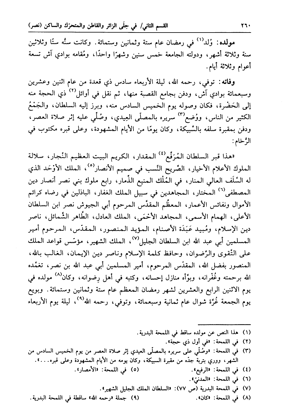 «هذا قبر السلطان المرفّع «4» المقدار، الكريم البيت العظيم النّجار، سلالة الملوك الأعلام الأخيار، الصّريح النّسب في صميم الأنصار «5» ، الملك الأوحد الذي له السّلف العالي المنار، في الملك المنيع الذّمار، رابع ملوك بني نصر أنصار دين المصطفى «6» المختار، المجاهدين في سبيل الملك الغفار، الباذلين في رضاه كرائم الأموال ونفائس الأعمار، المعظّم المقدّس المرحوم أبي الجيوش نصر ابن السلطان الأعلى، الهمام الأسمى، المجاهد الأحمى، الملك العادل، الطّاهر الشّمائل، ناصر دين الإسلام، ومبيد عبدة الأصنام، المؤيد المنصور، المقدّس، المرحوم أمير المسلمين أبي عبد الله ابن السلطان الجليل «7» ، الملك الشهير، مؤسّس قواعد الملك على التّقوى والرّضوان، وحافظ كلمة الإسلام وناصر دين الإيمان، الغالب بالله، المنصور بفضل الله، المقدّس المرحوم، أمير المسلمين أبي عبد الله بن نصر، تغمّده الله برحمته وغفرانه، وبوّأه منازل إحسانه، وكتبه في أهل رضوانه، وكان «8» مولده في يوم الاثنين الرابع والعشرين لشهر رمضان المعظم عام ستة وثمانين وستمائة. وبويع يوم الجمعة غرّة شوال عام ثمانية وسبعمائة، وتوفي، رحمه الله «9» ، ليلة يوم الأربعاء
