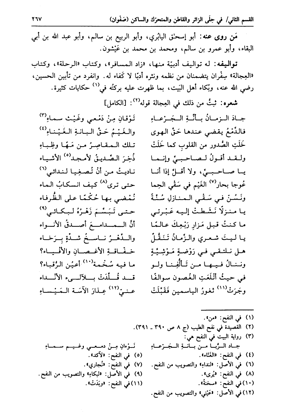 تواليفه: له تواليف أدبيّة منها، «زاد المسافر» ، وكتاب «الرحلة» ، وكتاب «العجالة» سفران يتضمنان من نظمه ونثره أدبا لا كفاء له. وانفرد من تأبين الحسين، رضي الله عنه، وبكاء أهل البيت، بما ظهرت عليه بركته في «1» حكايات كثيرة.