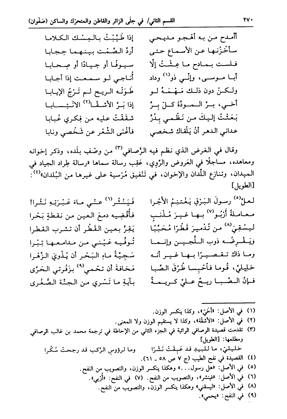 وقال في الغرض الذي نظم فيه الرّصافي «3» من وصف بلده، وذكر إخوانه ومعاهده، مساجلا في العروض والرّوي، عقب رسالة سماها «رسالة طراد الجياد في الميدان، وتنازع اللّدان والإخوان، في تنفيق مرسية على غيرها من البلدان» «4» :