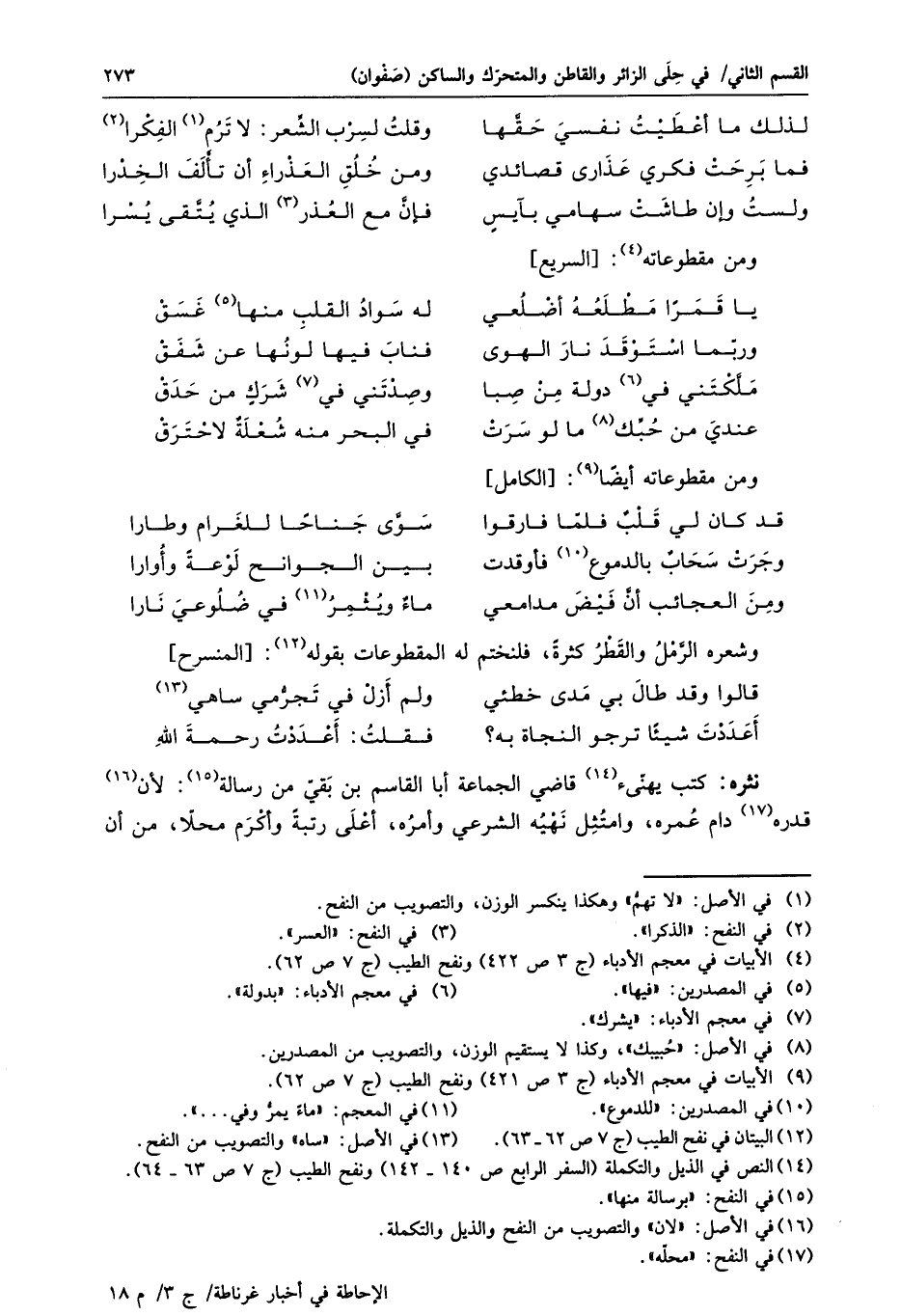 نثره: كتب يهنّئ «14» قاضي الجماعة أبا القاسم بن بقيّ من رسالة «15» : لأن «16» قدره «17» دام عمره، وامتثل نهيه الشرعي وأمره، أعلى رتبة وأكرم محلّا، من أن