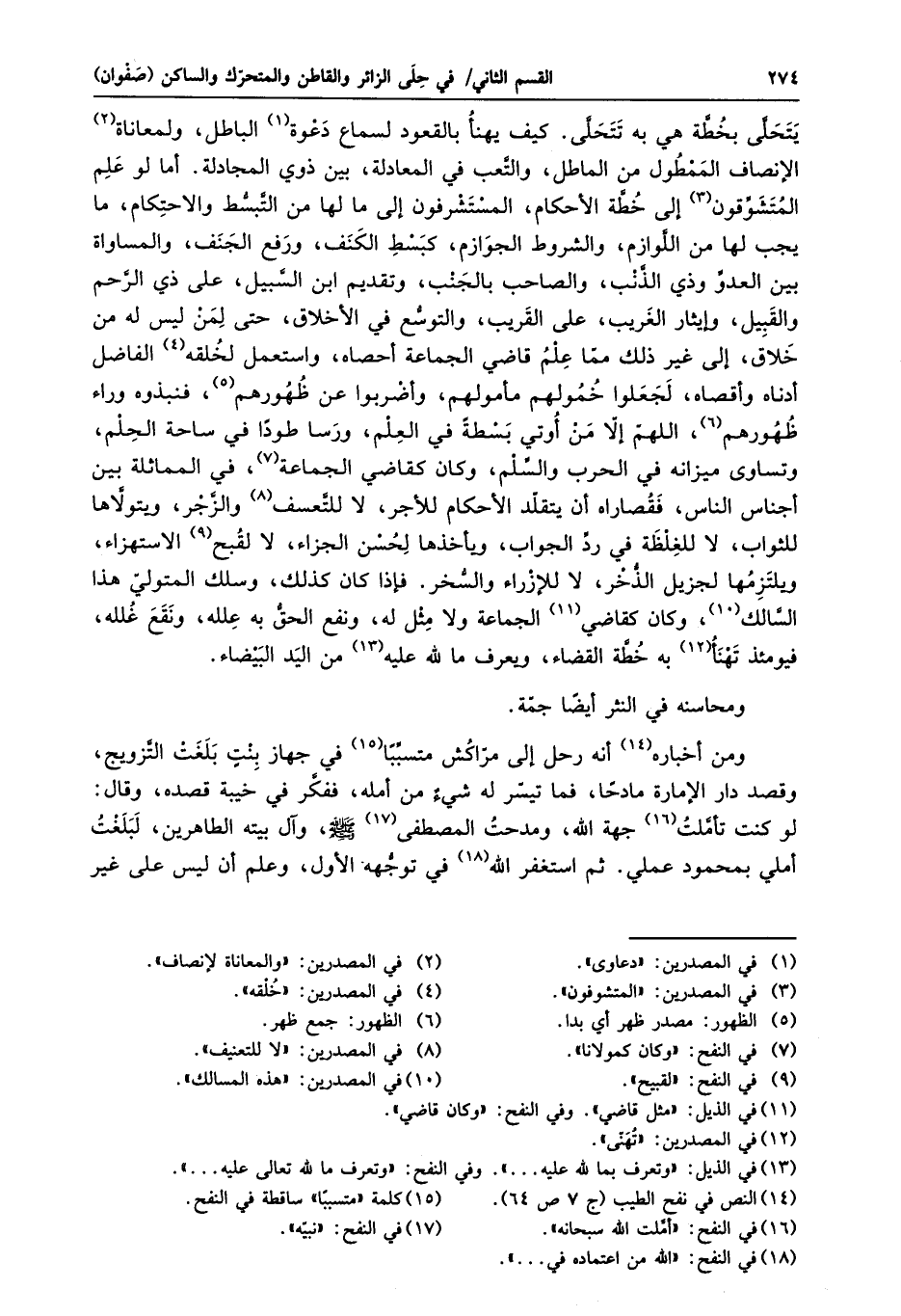 يتحلّى بخطّة هي به تتحلّى. كيف يهنأ بالقعود لسماع دعوة «1» الباطل، ولمعاناة «2» الإنصاف الممطول من الماطل، والتّعب في المعادلة، بين ذوي المجادلة. أما لو علم المتشوّقون «3» إلى خطّة الأحكام، المستشرفون إلى ما لها من التّبسّط والاحتكام، ما يجب لها من اللّوازم، والشروط الجوازم، كبسط الكنف، ورفع الجنف، والمساواة بين العدوّ وذي الذّنب، والصاحب بالجنب، وتقديم ابن السّبيل، على ذي الرّحم والقبيل، وإيثار الغريب، على القريب، والتوسّع في الأخلاق، حتى لمن ليس له من خلاق، إلى غير ذلك ممّا علم قاضي الجماعة أحصاه، واستعمل لخلقه «4» الفاضل أدناه وأقصاه، لجعلوا خمولهم مأمولهم، وأضربوا عن ظهورهم «5» ، فنبذوه وراء ظهورهم «6» ، اللهمّ إلّا من أوتي بسطة في العلم، ورسا طودا في ساحة الحلم، وتساوى ميزانه في الحرب والسّلم، وكان كقاضي الجماعة «7» ، في المماثلة بين أجناس الناس، فقصاراه أن يتقلّد الأحكام للأجر، لا للتّعسف «8» والزّجر، ويتولّاها للثواب، لا للغلظة في ردّ الجواب، ويأخذها لحسن الجزاء، لا لقبح «9» الاستهزاء، ويلتزمها لجزيل الذّخر، لا للإزراء والسّخر. فإذا كان كذلك، وسلك المتوليّ هذا السّالك «10» ، وكان كقاضي «11» الجماعة ولا مثل له، ونفع الحقّ به علله، ونقع غلله، فيومئذ تهنأ «12» به خطّة القضاء، ويعرف ما لله عليه «13» من اليد البيضاء.