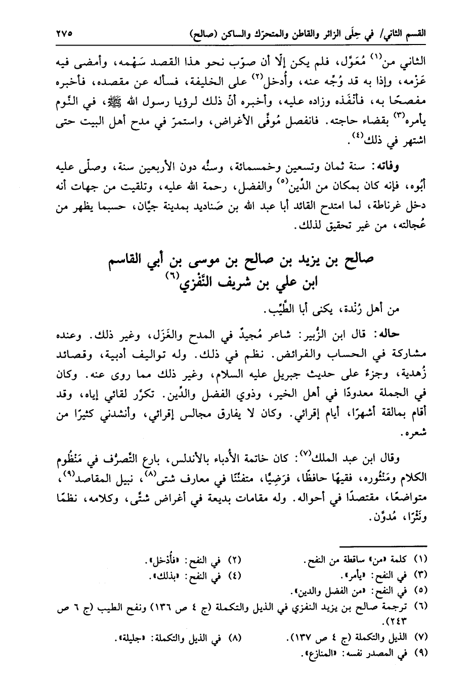 وفاته: سنة ثمان وتسعين وخمسمائة، وسنّه دون الأربعين سنة، وصلّى عليه أبوه، فإنه كان بمكان من الدّين «5» والفضل، رحمة الله عليه، وتلقيت من جهات أنه دخل غرناطة، لما امتدح القائد أبا عبد الله بن صناديد بمدينة جيّان، حسبما يظهر من عجالته، من غير تحقيق لذلك.