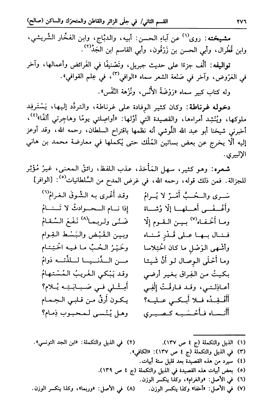 دخوله غرناطة: وكان كثير الوفادة على غرناطة، والتردّد إليها، يسترفد ملوكها، وينشد أمراءها، والقصيدة التي أوّلها: «أواصلتي يوما وهاجرتي ألفا» «4» ، أخبرني شيخنا أبو عبد الله اللّوشي أنه نظمها باقتراح السلطان، رحمه الله، وقد أوعز إليه ألّا يخرج عن بعض بساتين الملك حتى يكملها في معارضة محمد بن هاني الإلبيري.