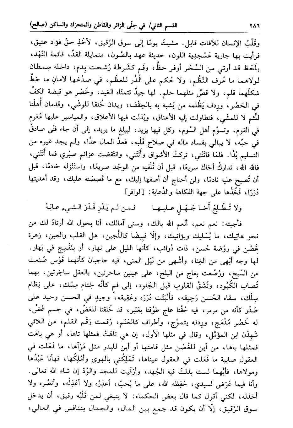 وأنا فيما عرض لسيدي، حفظه الله، على ما يحبّ، أعذره ولا أعذله، وأنصره ولا أخذله، لكني أقول كما قال بعض الحكماء: لا ينبغي لمن قلبه رقيق، أن يدخل سوق الرّقيق، إلّا أن يكون قد جمع بين المال، والجمال يتنافس في العالي،
