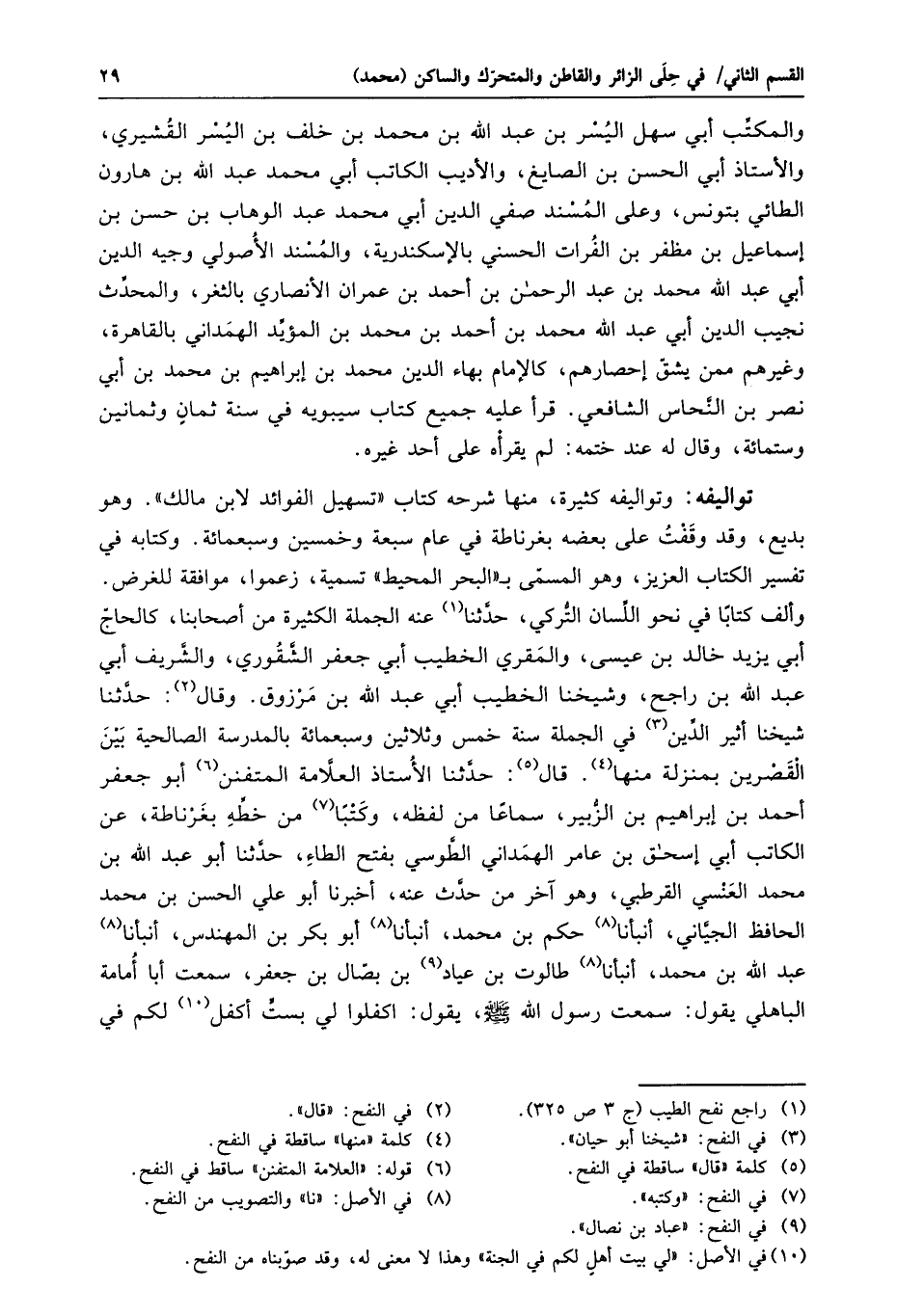 وألف كتابا في نحو اللّسان التّركي، حدّثنا «1» عنه الجملة الكثيرة من أصحابنا، كالحاجّ أبي يزيد خالد بن عيسى، والمقري الخطيب أبي جعفر الشّقوري، والشّريف أبي عبد الله بن راجح، وشيخنا الخطيب أبي عبد الله بن مرزوق. وقال «2» : حدّثنا شيخنا أثير الدّين «3» في الجملة سنة خمس وثلاثين وسبعمائة بالمدرسة الصالحية بين القصرين بمنزلة منها «4» . قال «5» : حدّثنا الأستاذ العلّامة المتفنن «6» أبو جعفر أحمد بن إبراهيم بن الزّبير، سماعا من لفظه، وكتبا «7» من خطّه بغرناطة، عن الكاتب أبي إسحاق بن عامر الهمداني الطّوسي بفتح الطاء، حدّثنا أبو عبد الله بن محمد العنسي القرطبي، وهو آخر من حدّث عنه، أخبرنا أبو علي الحسن بن محمد الحافظ الجيّاني، أنبأنا «8» حكم بن محمد، أنبأنا «9» أبو بكر بن المهندس، أنبأنا «10» عبد الله بن محمد، أنبأنا «11» طالوت بن عياد «12» بن بصّال بن جعفر، سمعت أبا أمامة الباهلي يقول: سمعت رسول الله صلى الله عليه وسلم، يقول: اكفلوا لي بستّ أكفل «13» لكم في