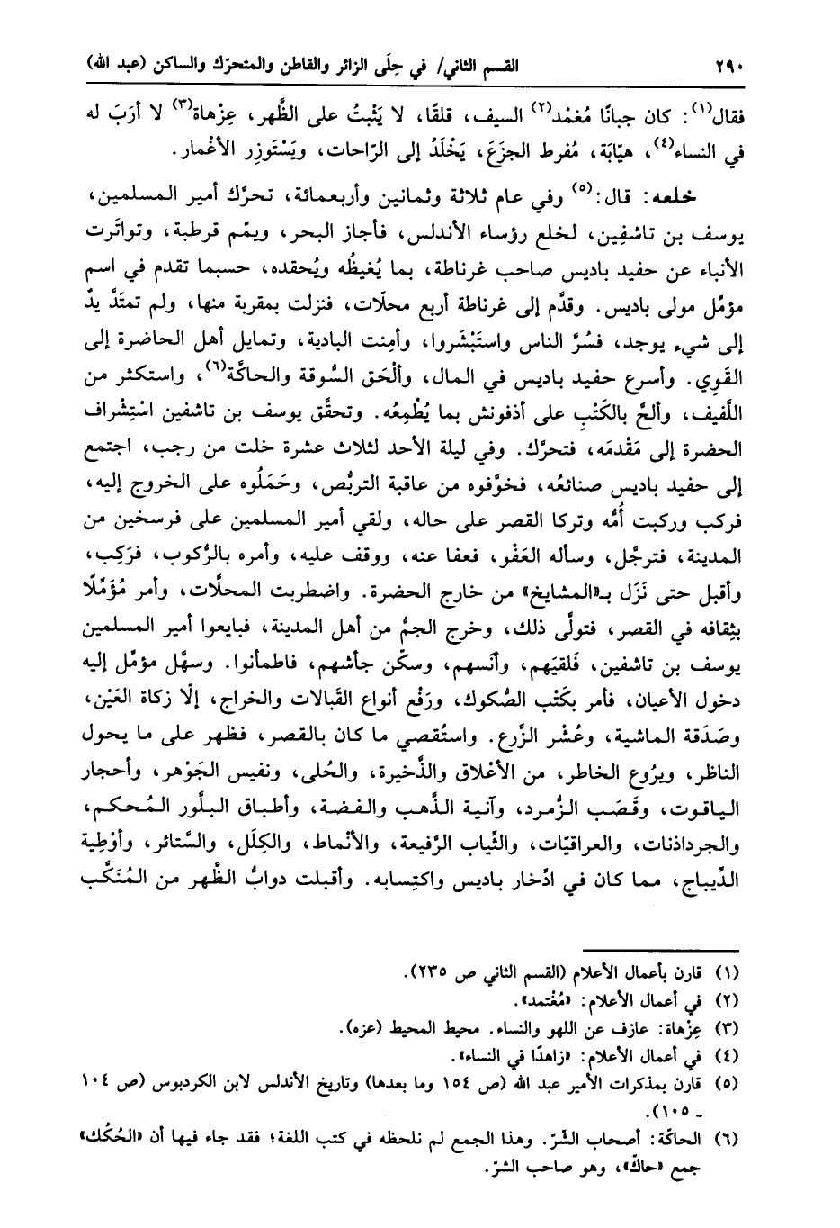 خلعه: قال: «5» وفي عام ثلاثة وثمانين وأربعمائة، تحرّك أمير المسلمين، يوسف بن تاشفين، لخلع رؤساء الأندلس، فأجاز البحر، ويمّم قرطبة، وتواترت الأنباء عن حفيد باديس صاحب غرناطة، بما يغيظه ويحقده، حسبما تقدم في اسم مؤمّل مولى باديس. وقدّم إلى غرناطة أربع محلّات، فنزلت بمقربة منها، ولم تمتدّ يد إلى شيء يوجد، فسرّ الناس واستبشروا، وأمنت البادية، وتمايل أهل الحاضرة إلى القوي. وأسرع حفيد باديس في المال، وألحق السّوقة والحاكّة «6» ، واستكثر من اللّفيف، وألحّ بالكتب على أذفونش بما يطمعه. وتحقّق يوسف بن تاشفين استشراف الحضرة إلى مقدمه، فتحرّك. وفي ليلة الأحد لثلاث عشرة خلت من رجب، اجتمع إلى حفيد باديس صنائعه، فخوّفوه من عاقبة التربّص، وحملوه على الخروج إليه، فركب وركبت أمّه وتركا القصر على حاله، ولقي أمير المسلمين على فرسخين من المدينة، فترجّل، وسأله العفو، فعفا عنه، ووقف عليه، وأمره بالرّكوب، فركب، وأقبل حتى نزل ب «المشايخ» من خارج الحضرة. واضطربت المحلّات، وأمر مؤمّلا بثقافه في القصر، فتولّى ذلك، وخرج الجمّ من أهل المدينة، فبايعوا أمير المسلمين يوسف بن تاشفين، فلقيهم، وأنسهم، وسكّن جأشهم، فاطمأنوا. وسهّل مؤمّل إليه دخول الأعيان، فأمر بكتب الصّكوك، ورفع أنواع القبالات والخراج، إلّا زكاة العين، وصدقة الماشية، وعشر الزّرع. واستقصي ما كان بالقصر، فظهر على ما يحول الناظر، ويروع الخاطر، من الأعلاق والذّخيرة، والحلى، ونفيس الجوهر، وأحجار الياقوت، وقصب الزّمرد، وآنية الذّهب والفضة، وأطباق البلّور المحكم، والجرداذنات، والعراقيّات، والثّياب الرّفيعة، والأنماط، والكلل، والسّتائر، وأوطية الدّيباج، مما كان في ادّخار باديس واكتسابه. وأقبلت دوابّ الظّهر من المنكّب