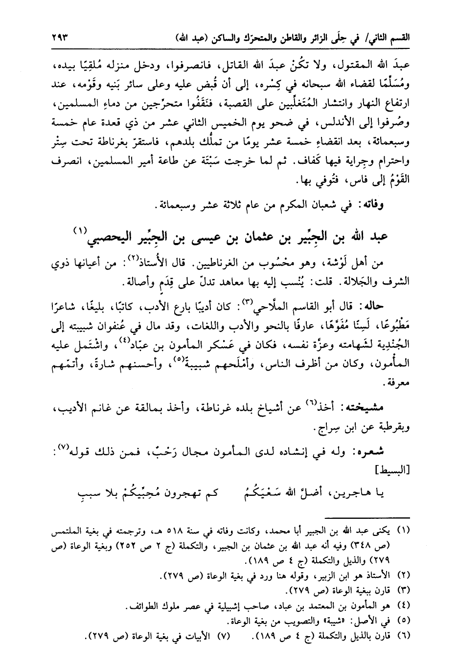 عبد الله المقتول، ولا تكن عبد الله القاتل، فانصرفوا، ودخل منزله ملقيا بيده، ومسلّما لقضاء الله سبحانه في كسره، إلى أن قبض عليه وعلى سائر بنيه وقومه، عند ارتفاع النهار وانتشار المتغلّبين على القصبة، فنقفوا متحرّجين من دماء المسلمين، وصرفوا إلى الأندلس، في ضحو يوم الخميس الثاني عشر من ذي قعدة عام خمسة وسبعمائة، بعد انقضاء خمسة عشر يوما من تملّك بلدهم، فاستقرّ بغرناطة تحت ستر واحترام وجراية فيها كفاف. ثم لما خرجت سبتة عن طاعة أمير المسلمين، انصرف القوم إلى فاس، فتوفي بها.