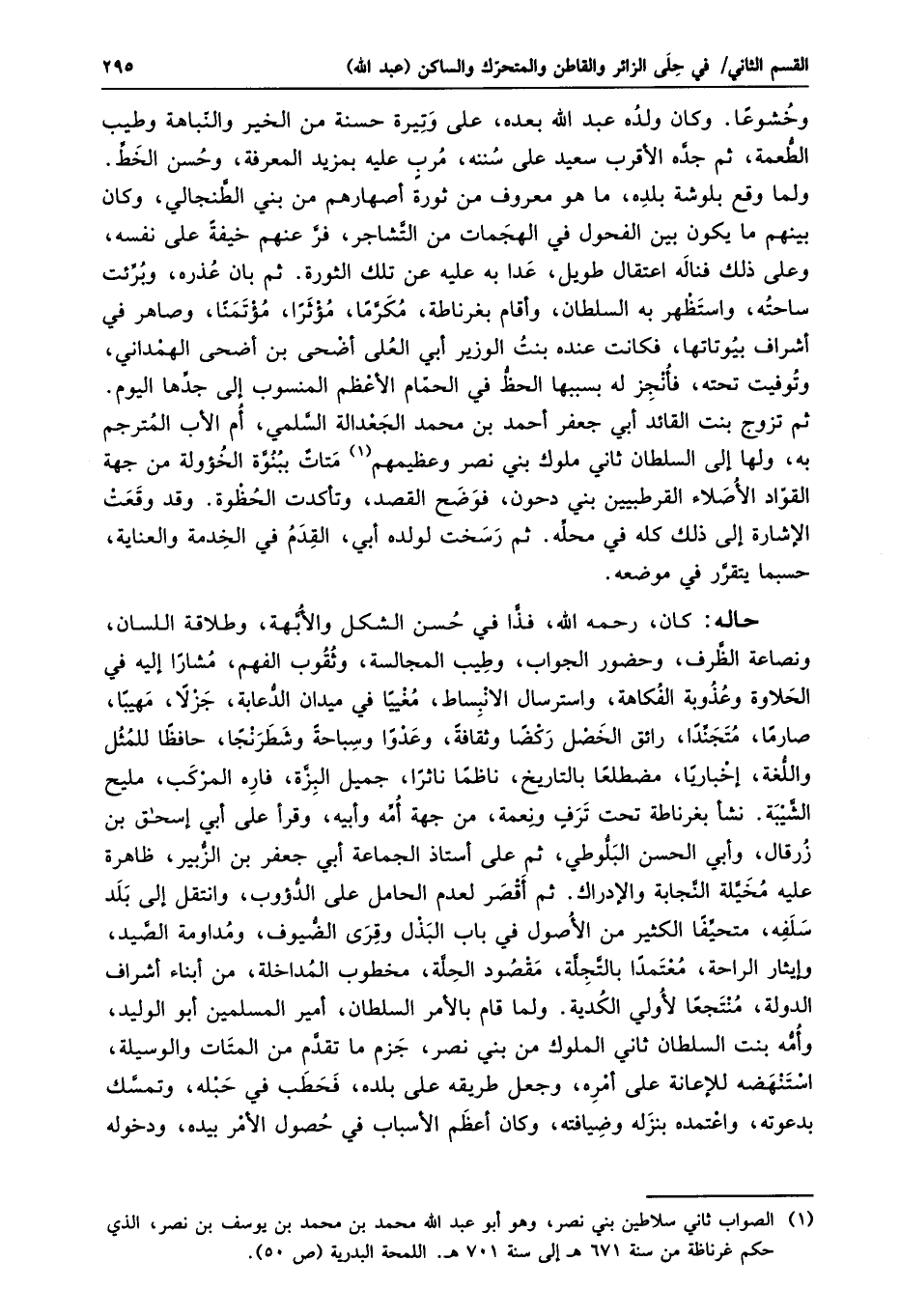 حاله: كان، رحمه الله، فذّا في حسن الشكل والأبّهة، وطلاقة اللسان، ونصاعة الظّرف، وحضور الجواب، وطيب المجالسة، وثقوب الفهم، مشارا إليه في الحلاوة وعذوبة الفكاهة، واسترسال الانبساط، مغييا في ميدان الدّعابة، جزلا، مهيبا، صارما، متجنّدا، رائق الخصل ركضا وثقافة، وعدوا وسباحة وشطرنجا، حافظا للمثل واللّغة، أخباريا، مضطلعا بالتاريخ، ناظما نائرا، جميل البزّة، فاره المركب، مليح الشّيبة. نشأ بغرناطة تحت ترف ونعمة، من جهة أمّه وأبيه، وقرأ على أبي إسحاق بن زرقال، وأبي الحسن البلّوطي، ثم على أستاذ الجماعة أبي جعفر بن الزّبير، ظاهرة عليه مخيّلة النّجابة والإدراك. ثم أقصر لعدم الحامل على الدّؤوب، وانتقل إلى بلد سلفه، متحيّفا الكثير من الأصول في باب البذل وقرى الضّيوف، ومداومة الصّيد، وإيثار الراحة، معتمدا بالتّجلّة، مقصود الحلّة، مخطوب المداخلة، من أبناء أشراف الدولة، منتجعا لأولي الكدية. ولما قام بالأمر السلطان، أمير المسلمين أبو الوليد، وأمّه بنت السلطان ثاني الملوك من بني نصر، جزم ما تقدّم من المتات والوسيلة، استنهضه للإعانة على أمره، وجعل طريقه على بلده، فحطب في حبله، وتمسّك بدعوته، واعتمده بنزله وضيافته، وكان أعظم الأسباب في حصول الأمر بيده، ودخوله