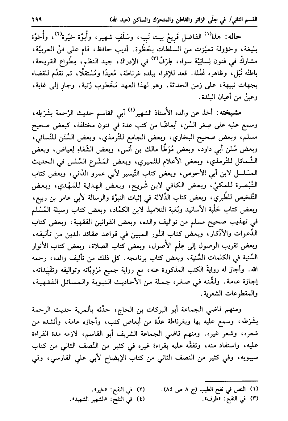 مشيخته: أخذ عن والده الأستاذ الشهير «4» أبي القاسم حديث الرّحمة بشرطه، وسمع عليه على صغر السّن، أبعاضا من كتب عدة في فنون مختلفة، كبعض صحيح مسلم، وبعض صحيح البخاري، وبعض الجامع للتّرمذي، وبعض السّنن للنّسائي، وبعض سنن أبي داود، وبعض موطّأ مالك بن أنس، وبعض الشّفاء لعياض، وبعض الشّمائل للتّرمذي، وبعض الأعلام للنّميري، وبعض المشرع السّلس في الحديث المسلسل لابن أبي الأحوص، وبعض كتاب التّيسير لأبي عمرو الدّاني، وبعض كتاب التّبصرة للمكيّ، وبعض الكافي لابن شريح، وبعض الهداية للمهدي، وبعض التّلخيص للطّبري، وبعض كتاب الدّلالة في إثبات النبوّة والرسالة لأبي عامر بن ربيع، وبعض كتاب حلبة الأسانيد وبغية التلاميذ لابن الكمّاد، وبعض كتاب وسيلة المسلم في تهذيب صحيح مسلم من تواليف والده، وبعض القوانين الفقهية، وبعض كتاب الدّعوات والأذكار، وبعض كتاب النّور المبين في قواعد عقائد الدين من تأليفه، وبعض تقريب الوصول إلى علم الأصول، وبعض كتاب الصلاة، وبعض كتاب الأنوار السّنية في الكلمات السّنية، وبعض كتاب برنامجه. كل ذلك من تأليف والده، رحمه الله. وأجاز له رواية الكتب المذكورة عنه، مع رواية جميع مرويّاته وتواليفه وتقييداته، إجازة عامة. ولقّنه في صغره جملة من الأحاديث النبوية والمسائل الفقهية، والمقطوعات الشعرية.