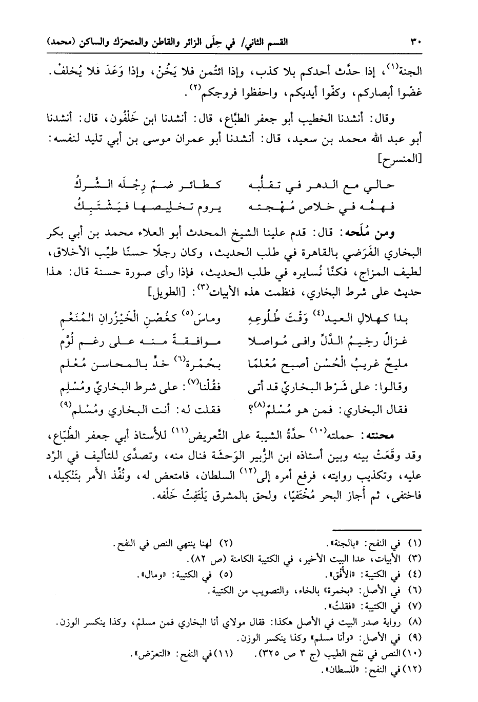 ومن ملحه: قال: قدم علينا الشيخ المحدث أبو العلاء محمد بن أبي بكر البخاري الفرضي بالقاهرة في طلب الحديث، وكان رجلا حسنا طيّب الأخلاق، لطيف المزاج، فكنّا نسايره في طلب الحديث، فإذا رأى صورة حسنة قال: هذا حديث على شرط البخاري، فنظمت هذه الأبيات «3» : [الطويل]