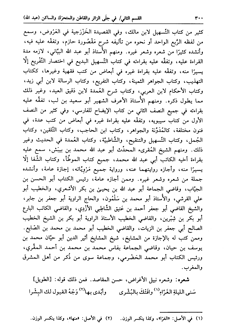 كثير من كتاب التّسهيل لابن مالك، وفي القصيدة الخزرجية في العروض، وسمع من لفظه الرّبع الواحد أو نحوه من تأليفه شرح مقصورة حازم، وتفقّه عليه فيه، وأنشده كثيرا من شعره وشعر غيره. ومنهم الأستاذ أبو عبد الله البيّاني، لازمه مدة القراءة عليه، وتفقّه عليه بقراءته في كتاب التّسهيل البديع في اختصار التّفريع إلّا يسيرا منه، وتفقّه عليه بقراءة غيره في أبعاض من كتب فقهية وغيرها، ككتاب التهذيب، وكتاب الجواهر الثمينة، وكتاب التفريع، وكتاب الرسالة لابن أبي زيد، وكتاب الأحكام لابن العربي، وكتاب شرح العمدة لابن دقيق العيد، وغير ذلك مما يطول ذكره. ومنهم الأستاذ الأعرف الشهير أبو سعيد بن لب، تفقّه عليه بقراءته في جميع النصف الثاني من كتاب الإيضاح للفارسي، وفي كثير من النصف الأول من كتاب سيبويه، وتفقّه عليه بقراءة غيره في أبعاض من كتب عدة، في فنون مختلفة، كالمدوّنة والجواهر، وكتاب ابن الحاجب، وكتاب التّلقين، وكتاب الجمل، وكتاب التّسهيل والتنقيح، والشّاطبيّة، وكتاب العمدة في الحديث وغير ذلك. ومنهم الشيخ المقرئ المحدّث أبو عبد الله محمد بن بيبش، سمع عليه بقراءة أخيه الكاتب أبي عبد الله محمد، جميع كتاب الموطّأ، وكتاب الشّفا إلّا يسيرا منه، وأجازه روايتهما عنه، ورواية جميع مرويّاته، إجازة عامة، وأنشده جملة من شعره وشعر غيره. وممن أجازه عامة، رئيس الكتاب أبو الحسن بن الجيّاب، وقاضي الجماعة أبو عبد الله بن يحيى بن بكر الأشعري، والخطيب أبو علي القرشي، والأستاذ أبو محمد بن سلمون، والحاج الراوية أبو جعفر بن جابر، والشيخ القاضي أبو جعفر أحمد بن عتيق الشّاطبي الأزدي، والقاضي الكاتب البارع أبو بكر بن شبرين، والقاضي الخطيب الأستاذ الراوية أبو بكر بن الشيخ الخطيب الصالح أبي جعفر بن الزيات، والقاضي الخطيب أبو محمد بن محمد بن الصّايع.