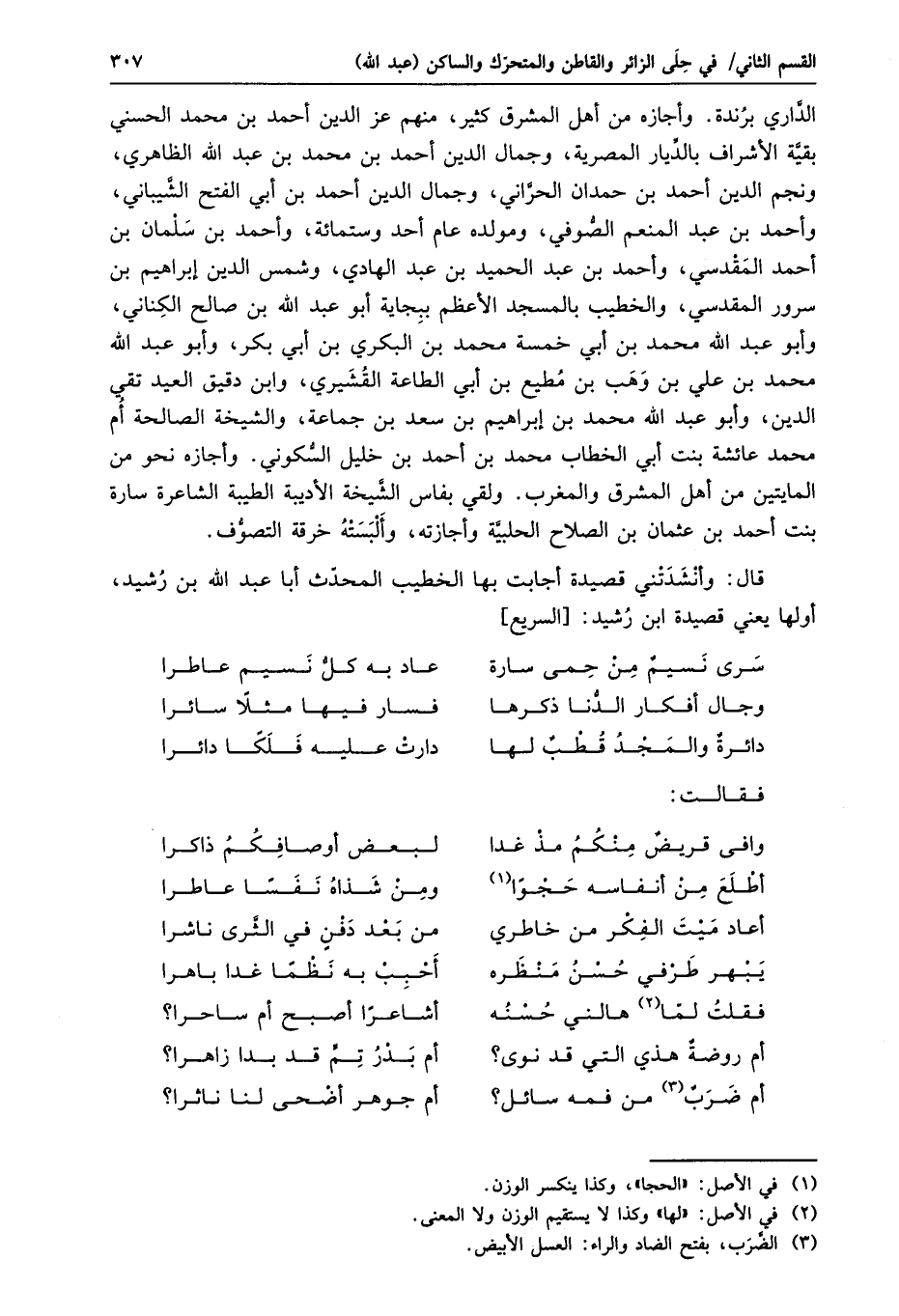 قال: وأنشدتني قصيدة أجابت بها الخطيب المحدّث أبا عبد الله بن رشيد، أولها يعني قصيدة ابن رشيد: [السريع]
