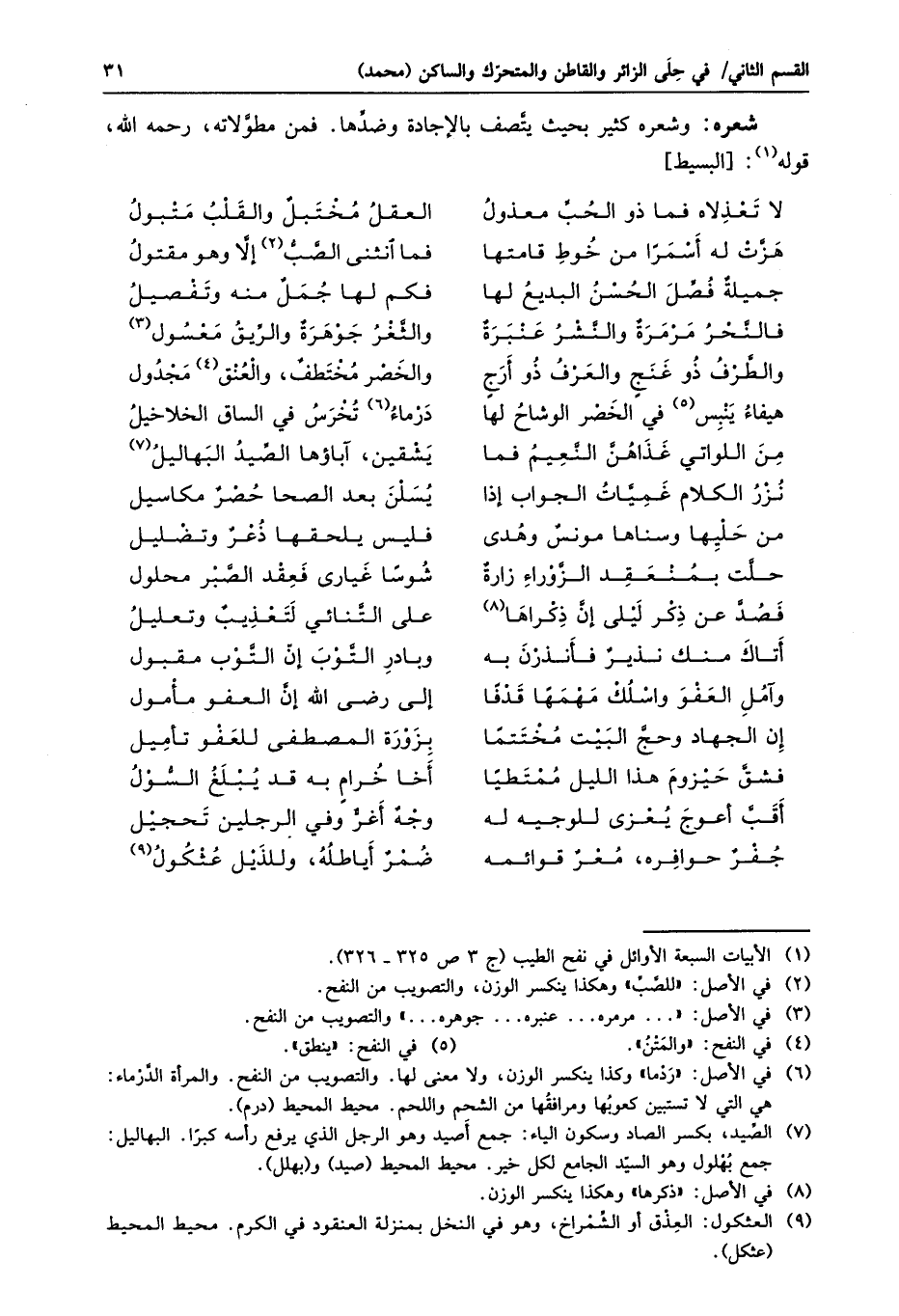 شعره: وشعره كثير بحيث يتّصف بالإجادة وضدّها. فمن مطوّلاته، رحمه الله، قوله «1» : [البسيط]