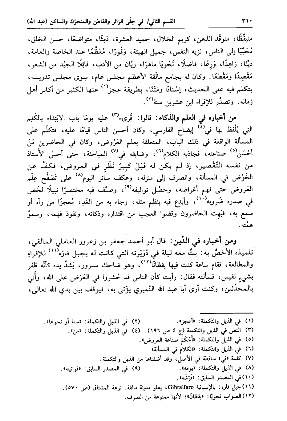 ومن أخباره في الدّين: قال أبو أحمد جعفر بن زعرور العاملي المالقي، تلميذه الأخصّ به: بتّ معه ليلة في دويرته التي كانت له بجبل فاره «11» للإقراء والمطالعة، فقام ساعة كنت فيها يقظانا «12» ، وهو ضاحك مسرور، يشدّ يده كأنّه ظفر بشيء نفيس، فسألته فقال: رأيت كأن الناس قد حشروا في العرض على الله، وأتي بالمحدّثين، وكنت أرى أبا عبد الله النّميري يؤتى به، فيوقف بين يدي الله تعالى،