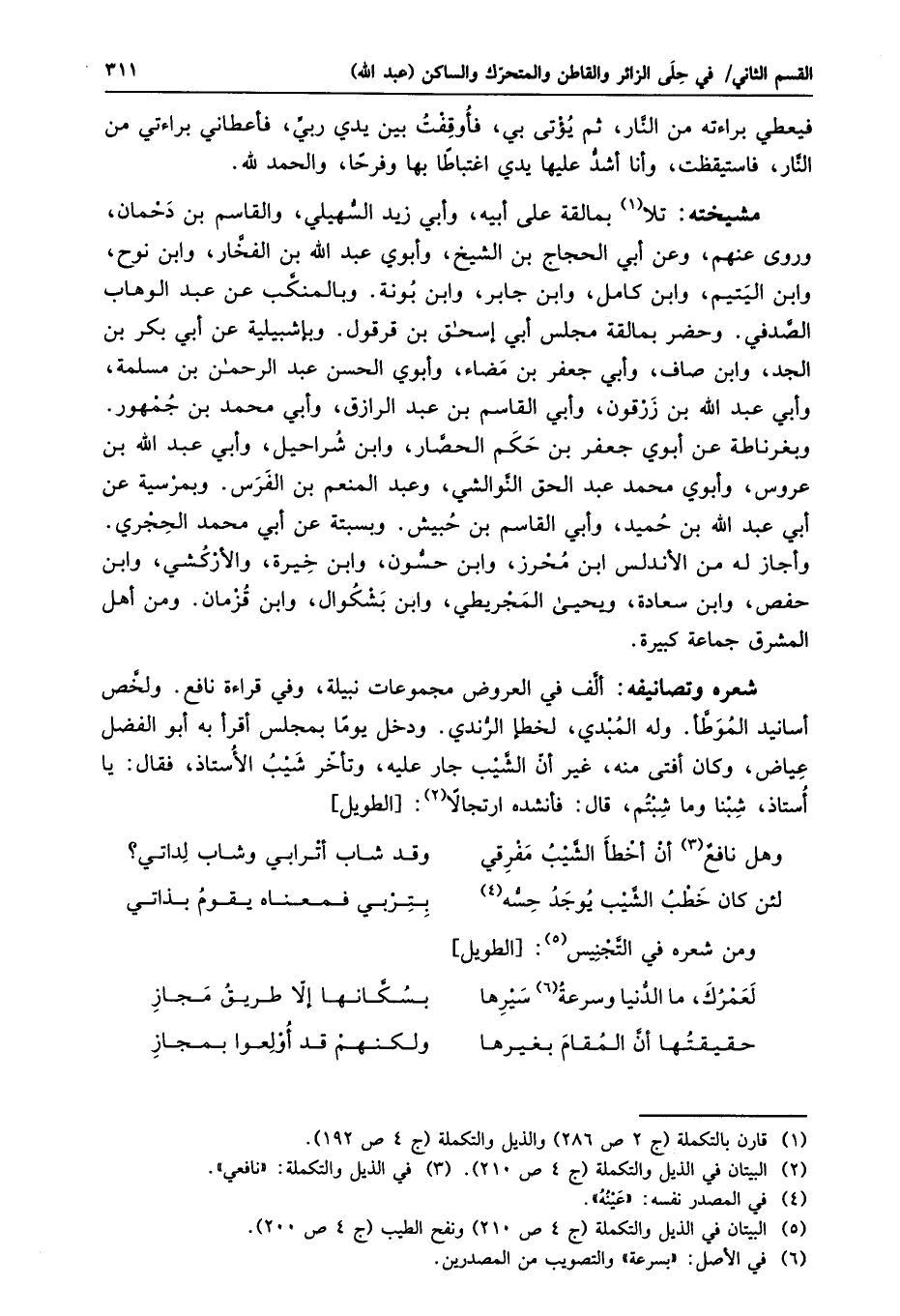 شعره وتصانيفه: ألّف في العروض مجموعات نبيلة، وفي قراءة نافع. ولخّص أسانيد الموطّأ. وله المبدي، لخطإ الرّندي. ودخل يوما بمجلس أقرأ به أبو الفضل عياض، وكان أفتى منه، غير أنّ الشّيب جار عليه، وتأخّر شيب الأستاذ، فقال: يا أستاذ، شبنا وما شبتم، قال: فأنشده ارتجالا «2» : [الطويل]
