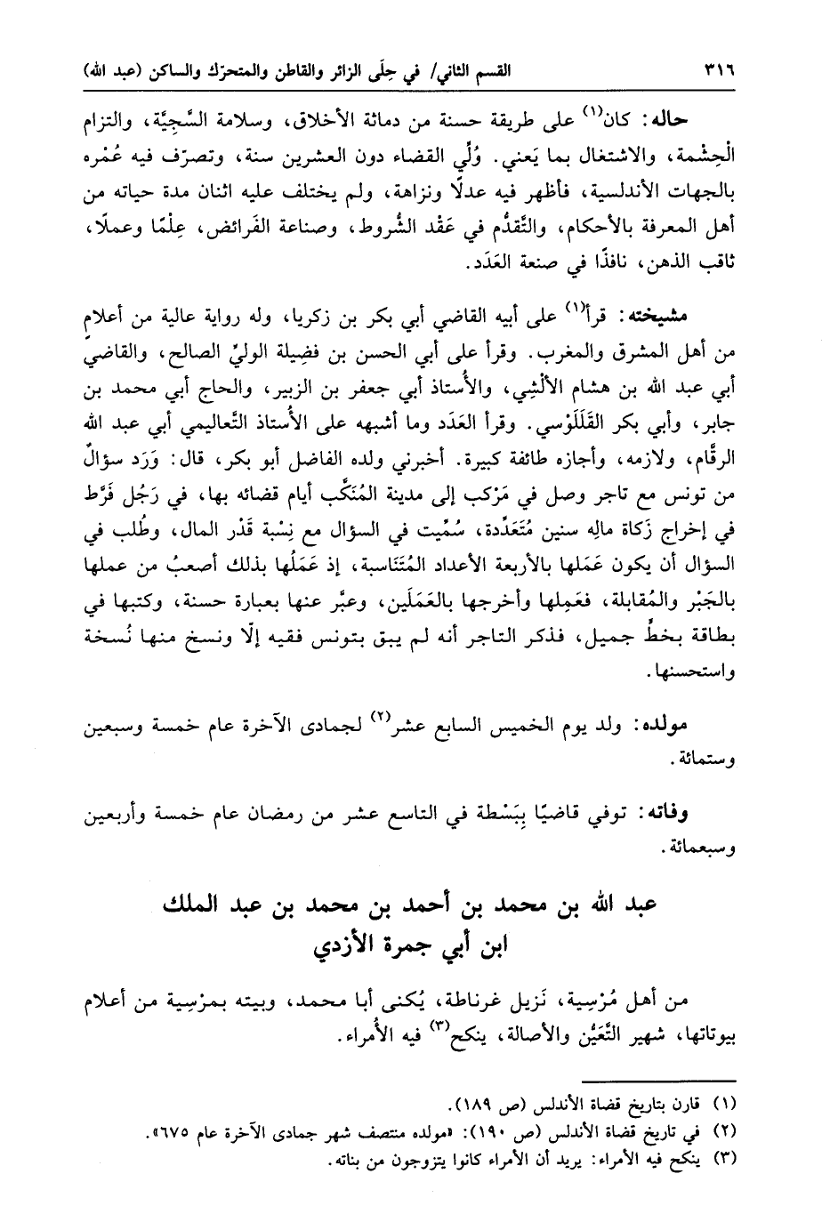 على طريقة حسنة من دمائة الأخلاق، وسلامة السّجيّة، والتزام الحشمة، والاشتغال بما يعني. ولّي القضاء دون العشرين سنة، وتصرّف فيه عمره بالجهات الأندلسية، فأظهر فيه عدلا ونزاهة، ولم يختلف عليه اثنان مدة حياته من أهل المعرفة بالأحكام، والتّقدّم في عقد الشّروط، وصناعة الفرائض، علما وعملا، ثاقب الذهن، نافذا في صنعة العدد.