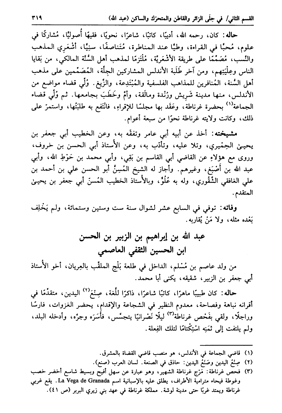 حاله: كان، رحمه الله، أديبا، كاتبا، شاعرا، نحويا، فقيها أصوليّا، مشاركا في علوم، محبّا في القراءة، وطيّا عند المناطرة، متناصفا، سنيّا، أشعري المذهب والنّسب، مصمّما على طريقة الأشعريّة، ملتزما لمذهب أهل السّنّة المالكي، من بقايا الناس وعليتهم، ومن آخر طلبة الأندلس المشاركين الجلّة، المصمّمين على مذهب أهل السّنة، المنافرين للمذاهب الفلسفية والمبتدعة، والزّيغ. ولّي قضاء مواضع من الأندلس، منها مدينة شريش ورندة ومالقة، وأمّ وخطب بجامعها. ثم ولّي قضاء الجماعة «1» بحضرة غرناطة، وعقد بها مجلسا للإقراء، فانتفع به طلبتها، واستمرّ على ذلك، وكانت ولايته غرناطة نحوا من سبعة أعوام.