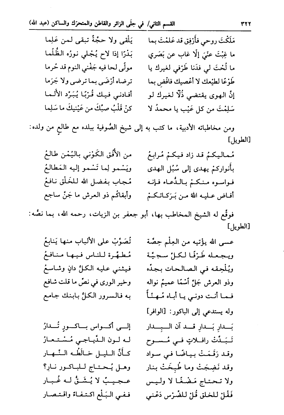 ومن مخاطباته الأدبية، ما كتب به إلى شيخ الصّوفية ببلده مع طالع من ولده: