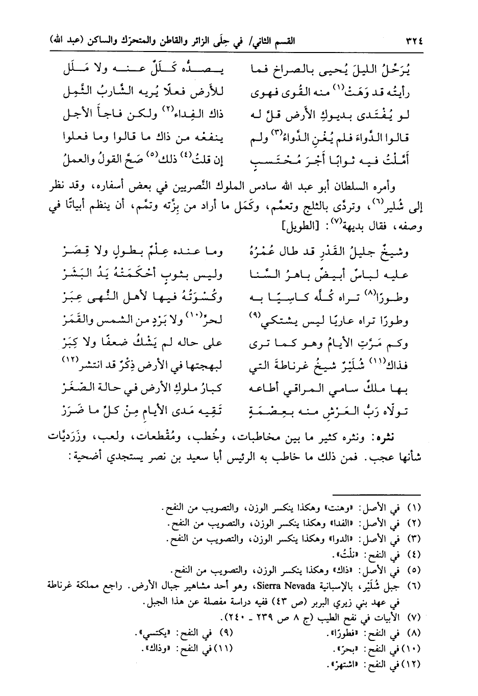 وأمره السلطان أبو عبد الله سادس الملوك النّصريين في بعض أسفاره، وقد نظر إلى شلير «6» ، وتردّى بالثلج وتعمّم، وكمل ما أراد من بزّته وتمّم، أن ينظم أبياتا في وصفه، فقال بديهة «7» : [الطويل]