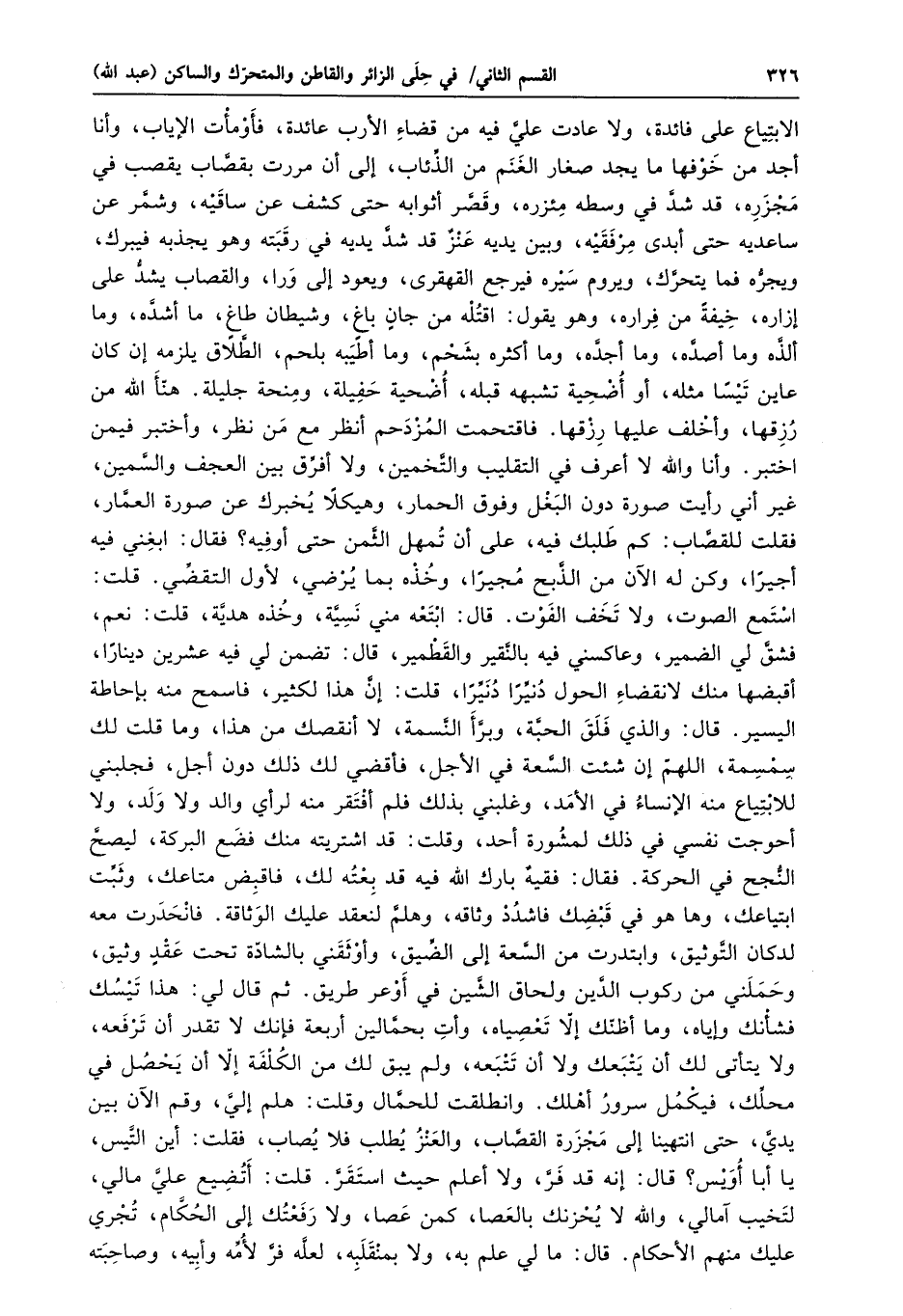 الابتياع على فائدة، ولا عادت عليّ فيه من قضاء الأرب عائدة، فأومأت الإياب، وأنا أجد من خوفها ما يجد صغار الغنم من الذّئاب، إلى أن مررت بقصّاب يقصب في مجزره، قد شدّ في وسطه مئزره، وقصّر أثوابه حتى كشف عن ساقيه، وشمّر عن ساعديه حتى أبدى مرفقيه، وبين يديه عنز قد شدّ يديه في رقبته وهو يجذبه فيبرك، ويجرّه فما يتحرّك، ويروم سيره فيرجع القهقرى، ويعود إلى ورا، والقصاب يشدّ على إزاره، خيفة من فراره، وهو يقول: اقتله من جان باغ، وشيطان طاغ، ما أشدّه، وما ألذّه وما أصدّه، وما أجدّه، وما أكثره بشحم، وما أطيبه بلحم، الطّلاق يلزمه إن كان عاين تيسا مثله، أو أضحية تشبهه قبله، أضحية حفيلة، ومنحة جليلة. هنّأ الله من رزقها، وأخلف عليها رزقها. فاقتحمت المزدحم أنظر مع من نظر، وأختبر فيمن اختبر. وأنا والله لا أعرف في التقليب والتّخمين، ولا أفرّق بين العجف والسّمين، غير أني رأيت صورة دون البغل وفوق الحمار، وهيكلا يخبرك عن صورة العمّار، فقلت للقصّاب: كم طلبك فيه، على أن تمهل الثّمن حتى أوفيه؟ فقال: ابغني فيه أجيرا، وكن له الآن من الذّبح مجيرا، وخذه بما يرضي، لأول التقضّي. قلت:
