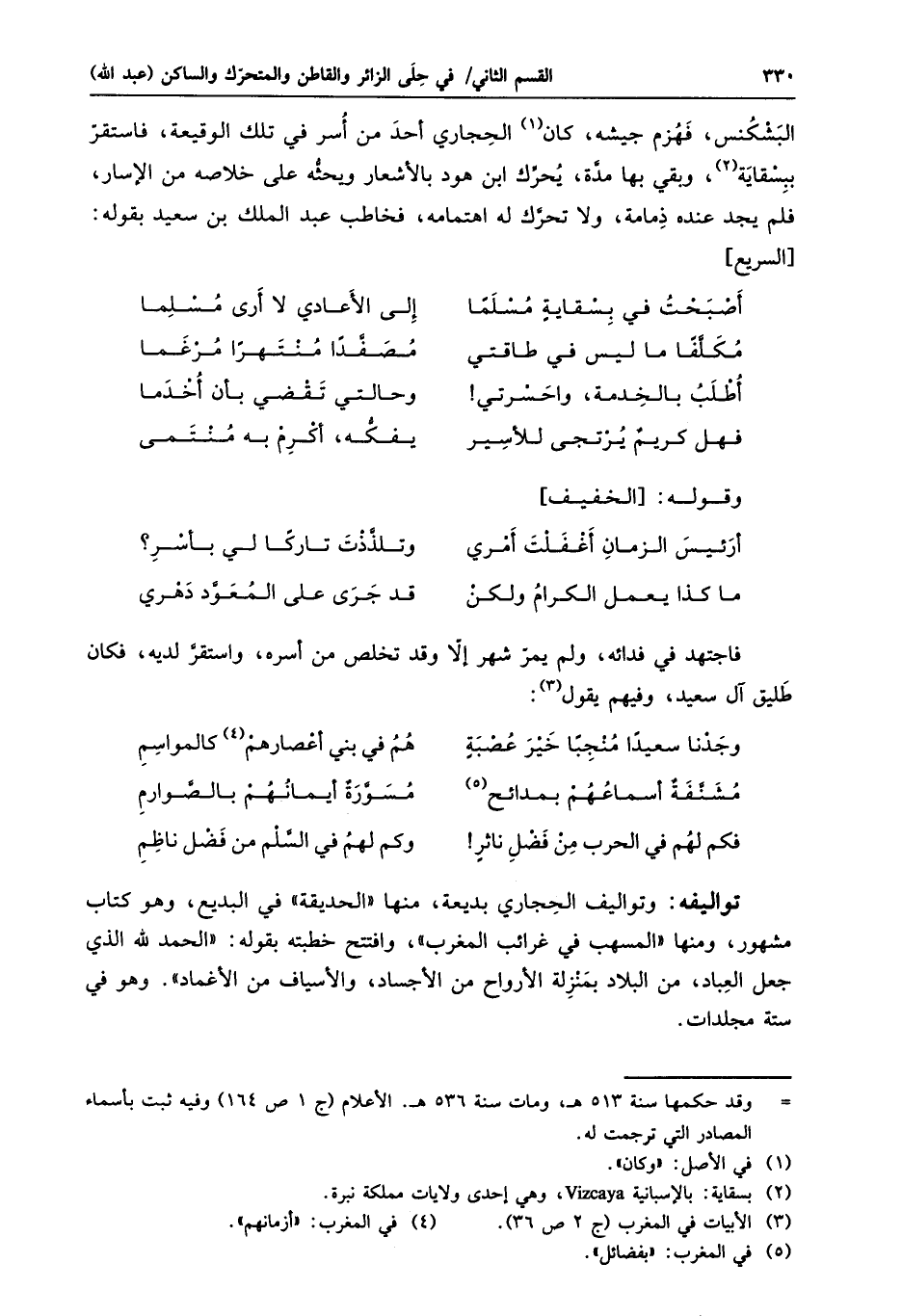 البشكنس، فهزم جيشه، كان «1» الحجاري أحد من أسر في تلك الوقيعة، فاستقرّ ببسقاية «2» ، وبقي بها مدّة، يحرّك ابن هود بالأشعار ويحثّه على خلاصه من الإسار، فلم يجد عنده ذمامة، ولا تحرّك له اهتمامه، فخاطب عبد الملك بن سعيد بقوله: