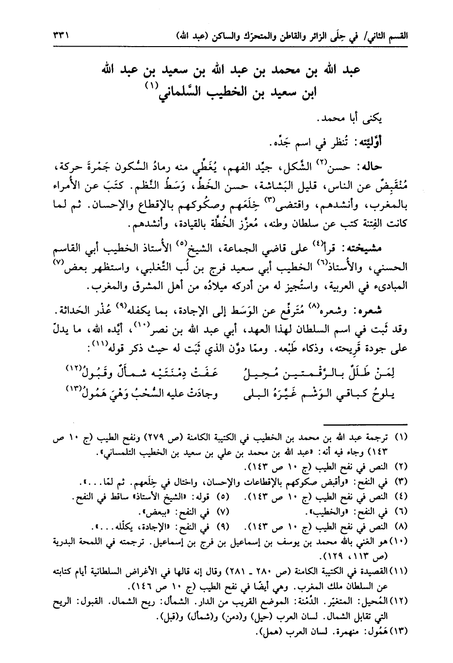 وقد ثبت في اسم السلطان لهذا العهد، أبي عبد الله بن نصر «10» ، أيّده الله، ما يدلّ على جودة قريحته، وذكاء طبعه. وممّا دوّن الذي ثبت له حيث ذكر قوله «11» :