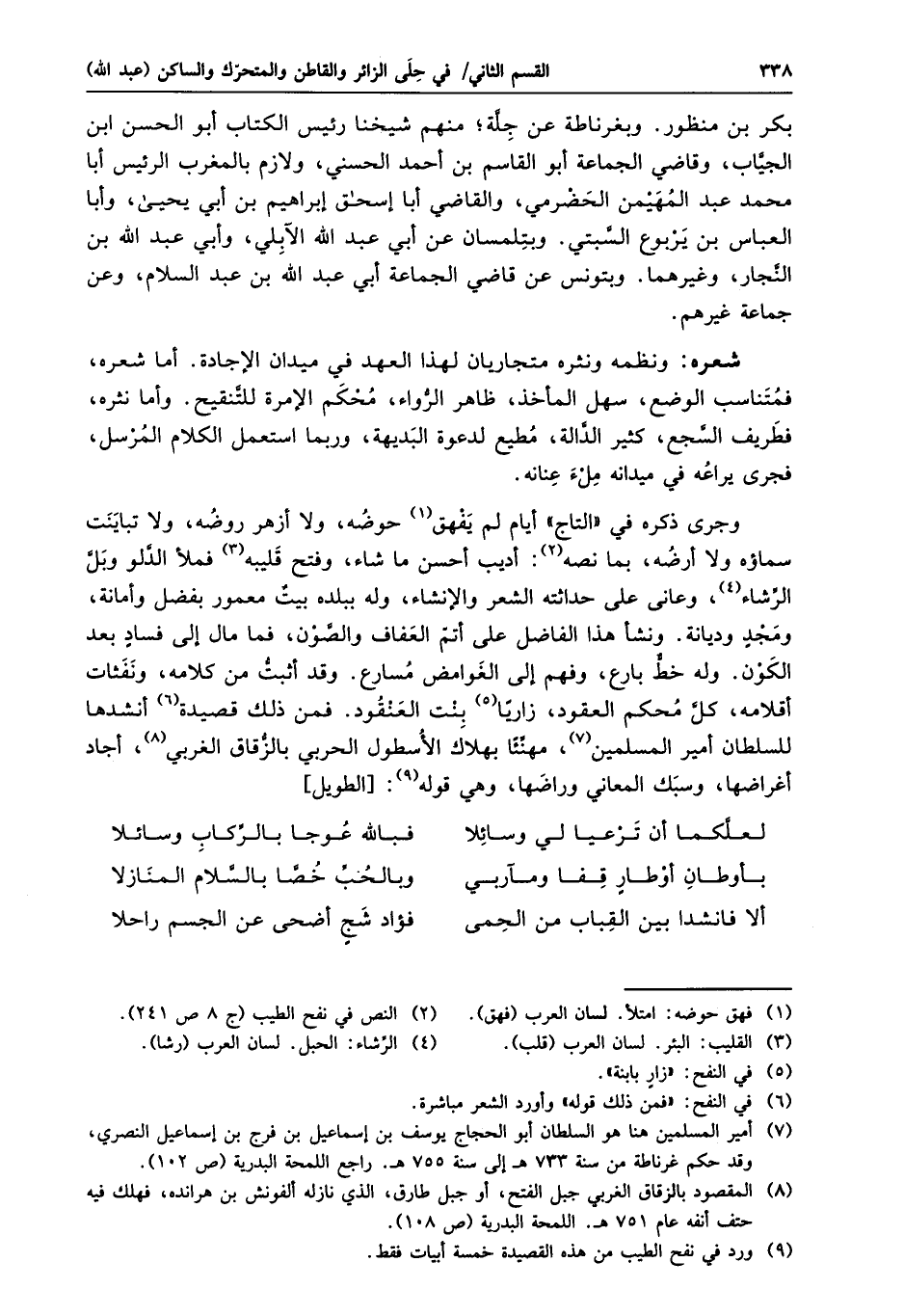 وجرى ذكره في «التاج» أيام لم يفهق «1» حوضه، ولا أزهر روضه، ولا تباينت سماؤه ولا أرضه، بما نصه «2» : أديب أحسن ما شاء، وفتح قليبه «3» فملأ الدّلو وبلّ الرّشاء «4» ، وعانى على حداثته الشعر والإنشاء، وله ببلده بيت معمور بفضل وأمانة، ومجد وديانة. ونشأ هذا الفاضل على أتمّ العفاف والصّون، فما مال إلى فساد بعد الكون. وله خطّ بارع، وفهم إلى الغوامض مسارع. وقد أثبتّ من كلامه، ونفثات أقلامه، كلّ محكم العقود، زاريا «5» بنت العنقود. فمن ذلك قصيدة «6» أنشدها للسلطان أمير المسلمين «7» ، مهنّئا بهلاك الأسطول الحربي بالزّقاق الغربي «8» ، أجاد أغراضها، وسبك المعاني وراضها، وهي قوله «9» : [الطويل]