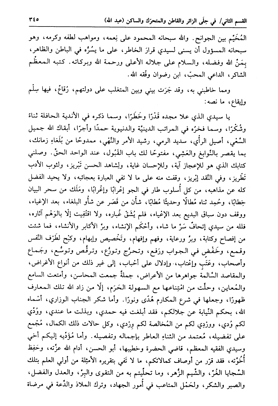 المخيّم بين الجوانح. والله سبحانه المحمود على نعمه، ومواهب لطفه وكرمه، وهو سبحانه المسؤول أن يسنى لسيدي قرار الخاطر، على ما يسرّه في الباطن والظاهر، بمنّ الله وفضله، والسلام على جلاله الأعلى ورحمة الله وبركاته. كتبه المعظّم الشاكر، الداعي المحبّ، ابن رضوان وفّقه الله.