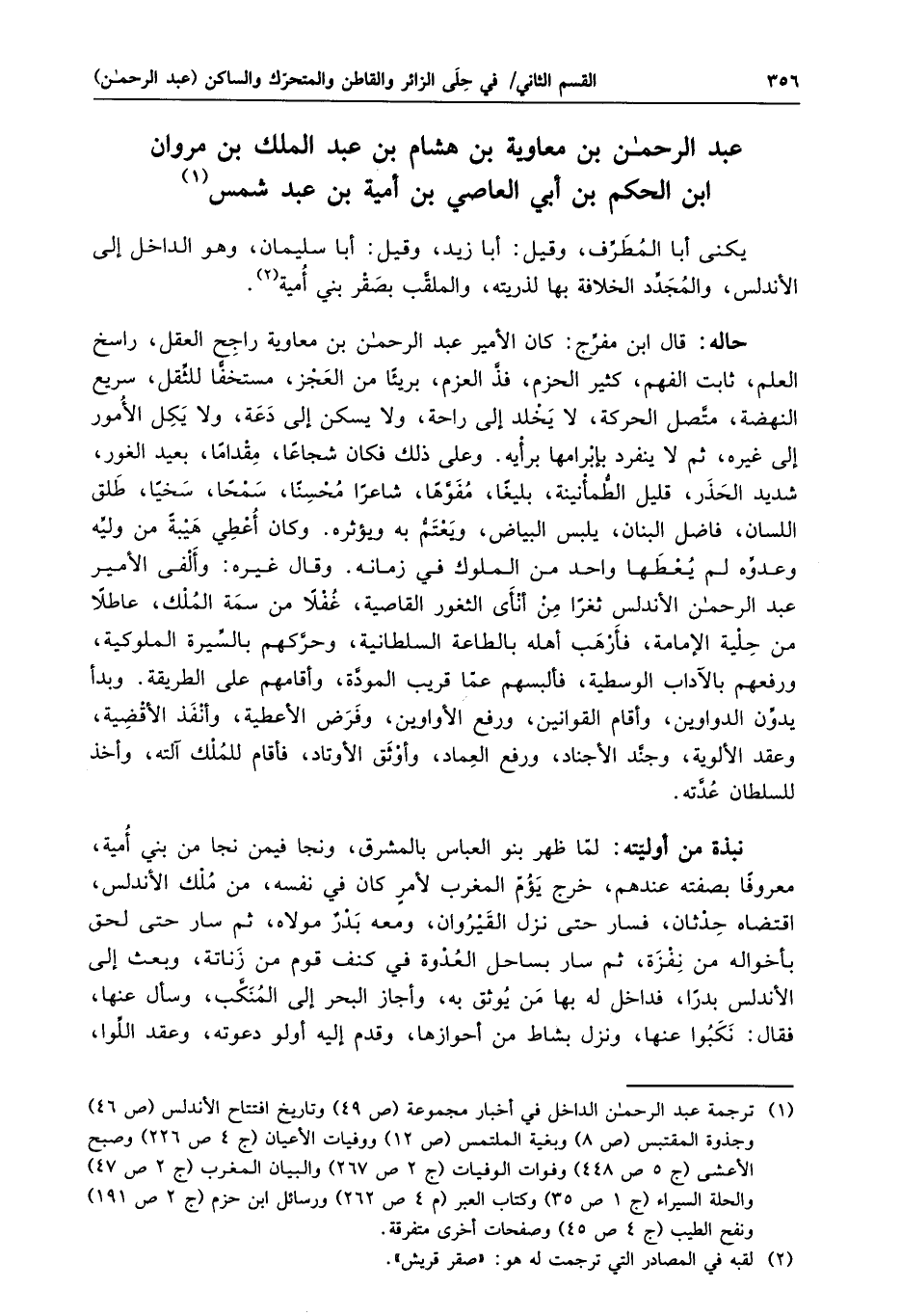 يكنى أبا المطرّف، وقيل: أبا زيد، وقيل: أبا سليمان، وهو الداخل إلى الأندلس، والمجدّد الخلافة بها لذريته، والملقّب بصقر بني أمية «2» .