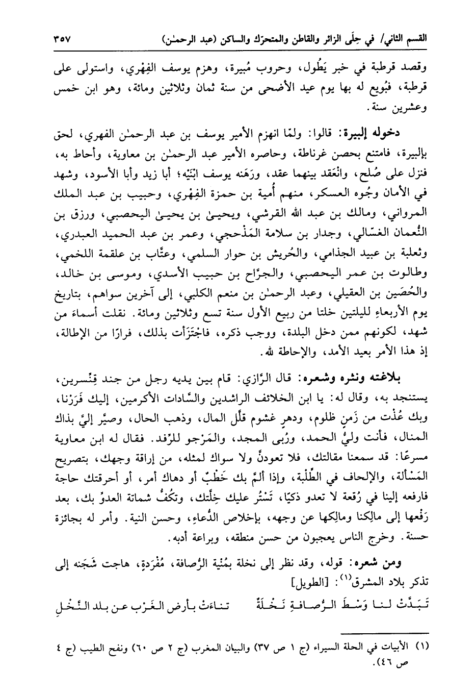 دخوله إلبيرة: قالوا: ولمّا انهزم الأمير يوسف بن عبد الرحمن الفهري، لحق بإلبيرة، فامتنع بحصن غرناطة، وحاصره الأمير عبد الرحمن بن معاوية، وأحاط به، فنزل على صلح، وانعقد بينهما عقد، ورهنه يوسف ابنيه؛ أبا زيد وأبا الأسود، وشهد في الأمان وجوه العسكر، منهم أمية بن حمزة الفهري، وحبيب بن عبد الملك المرواني، ومالك بن عبد الله القرشي، ويحيى بن يحيى اليحصبي، ورزق بن النّعمان الغسّالي، وجدار بن سلامة المذحجي، وعمر بن عبد الحميد العبدري، وثعلبة بن عبيد الجذامي، والحريش بن حوار السلمي، وعتّاب بن علقمة اللخمي، وطالوت بن عمر اليحصبي، والجرّاح بن حبيب الأسدي، وموسى بن خالد، والحصين بن العقيلي، وعبد الرحمن بن منعم الكلبي، إلى آخرين سواهم، بتاريخ يوم الأربعاء لليلتين خلتا من ربيع الأول سنة تسع وثلاثين ومائة. نقلت أسماء من شهد، لكونهم ممن دخل البلدة، ووجب ذكره، فاجتزأت بذلك، فرارا من الإطالة، إذ هذا الأمر بعيد الأمد، والإحاطة لله.
