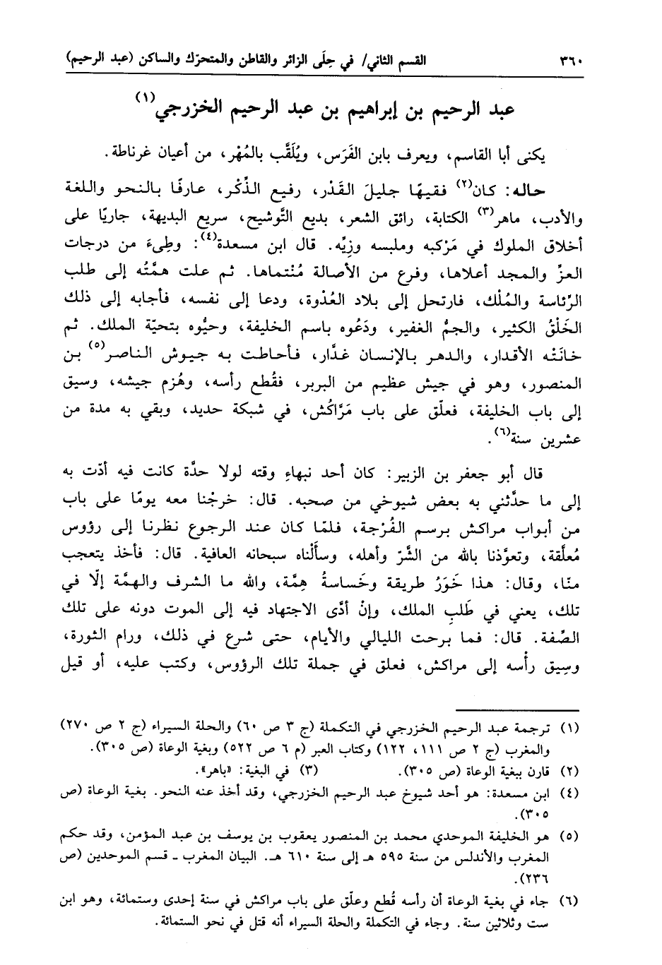قال أبو جعفر بن الزبير: كان أحد نبهاء وقته لولا حدّة كانت فيه أدّت به إلى ما حدّثني به بعض شيوخي من صحبه. قال: خرجنا معه يوما على باب من أبواب مراكش برسم الفرجة، فلمّا كان عند الرجوع نظرنا إلى رؤوس معلّقة، وتعوّذنا بالله من الشّرّ وأهله، وسألناه سبحانه العافية. قال: فأخذ يتعجب منّا، وقال: هذا خور طريقة وخساسة همّة، والله ما الشرف والهمّة إلّا في تلك، يعني في طلب الملك، وإن أدّى الاجتهاد فيه إلى الموت دونه على تلك الصّفة. قال: فما برحت الليالي والأيام، حتى شرع في ذلك، ورام الثورة، وسيق رأسه إلى مراكش، فعلق في جملة تلك الرءوس، وكتب عليه، أو قيل