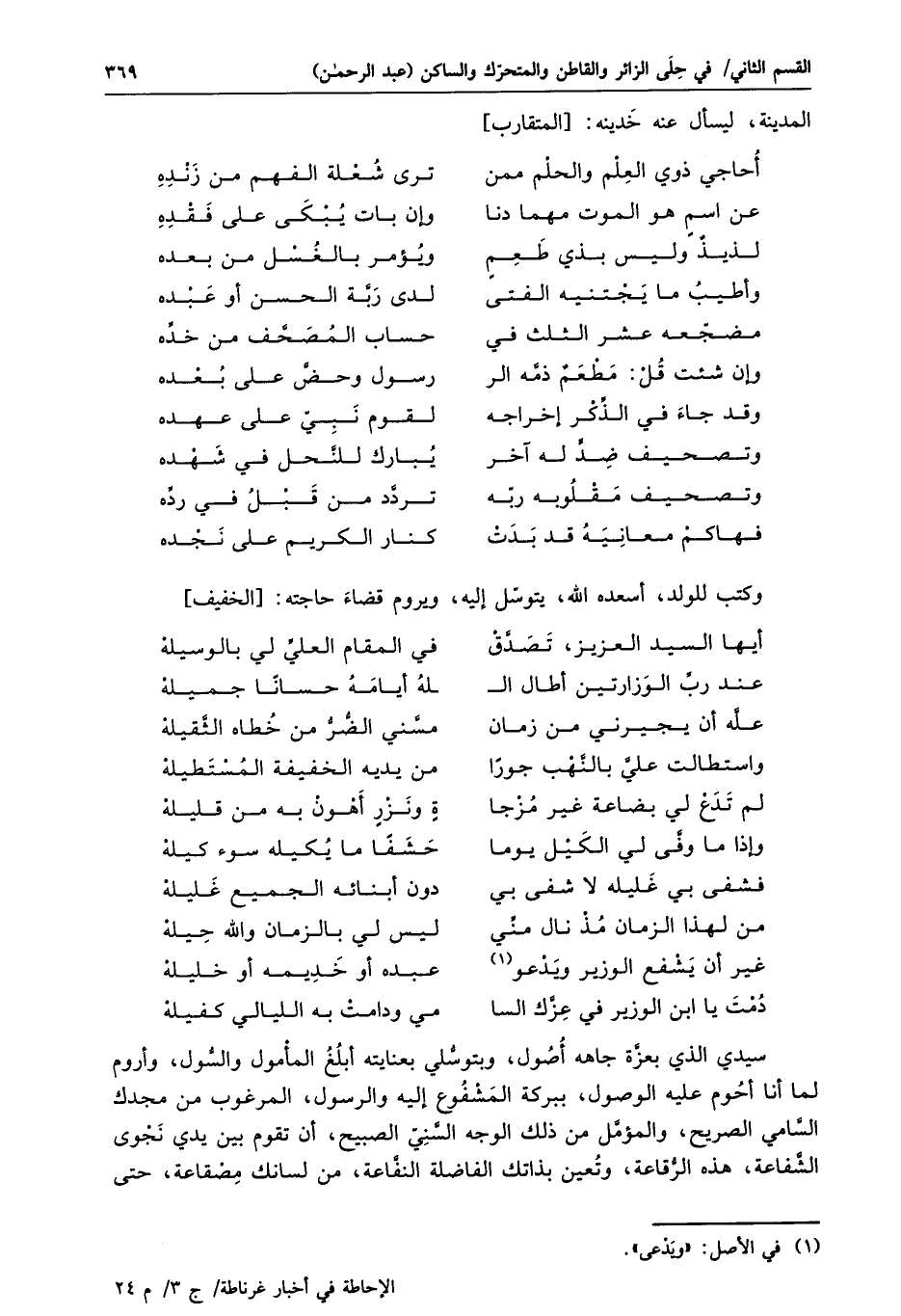 سيدي الذي بعزّة جاهه أصول، وبتوسّلي بعنايته أبلغ المأمول والسّول، وأروم لما أنا أحوم عليه الوصول، ببركة المشفوع إليه والرسول، المرغوب من مجدك السّامي الصريح، والمؤمّل من ذلك الوجه السّنيّ الصبيح، أن تقوم بين يدي نجوى الشّفاعة، هذه الرّقاعة، وتعين بذاتك الفاضلة النفّاعة، من لسانك مصقاعة، حتى