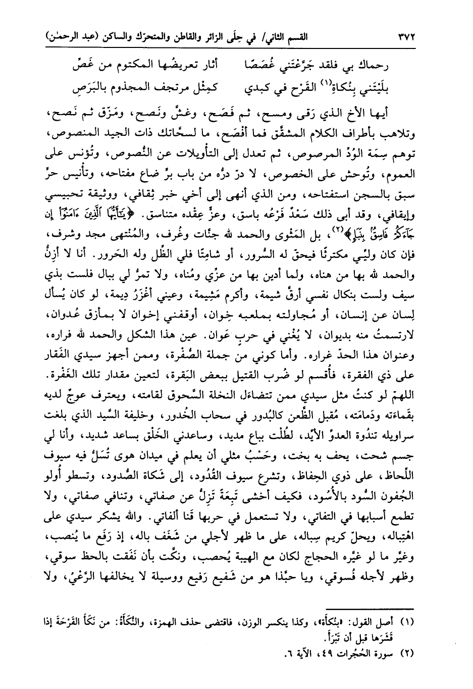 أيها الأخ الذي رقى ومسح، ثم فصح، وغشّ ونصح، ومزّق ثم نصح، وتلاهب بأطراف الكلام المشقّق فما أفصح، ما لسحّاتك ذات الجيد المنصوص، توهم سمة الودّ المرصوص، ثم تعدل إلى التأويلات عن النّصوص، وتؤنس على العموم، وتوحش على الخصوص، لا درّ درّه من باب برّ ضاع مفتاحه، وتأنيس حرّ سبق بالسجن استفتاحه، ومن الذي أنهى إلى أخي خبر ثقافي، ووثيقة تحبيسي وإيقافي، وقد أبى ذلك سعد فرعه باسق، وعزّ عقده متناسق. يا أَيُّهَا الَّذِينَ آمَنُوا إِنْ جاءَكُمْ فاسِقٌ بِنَبَإٍ